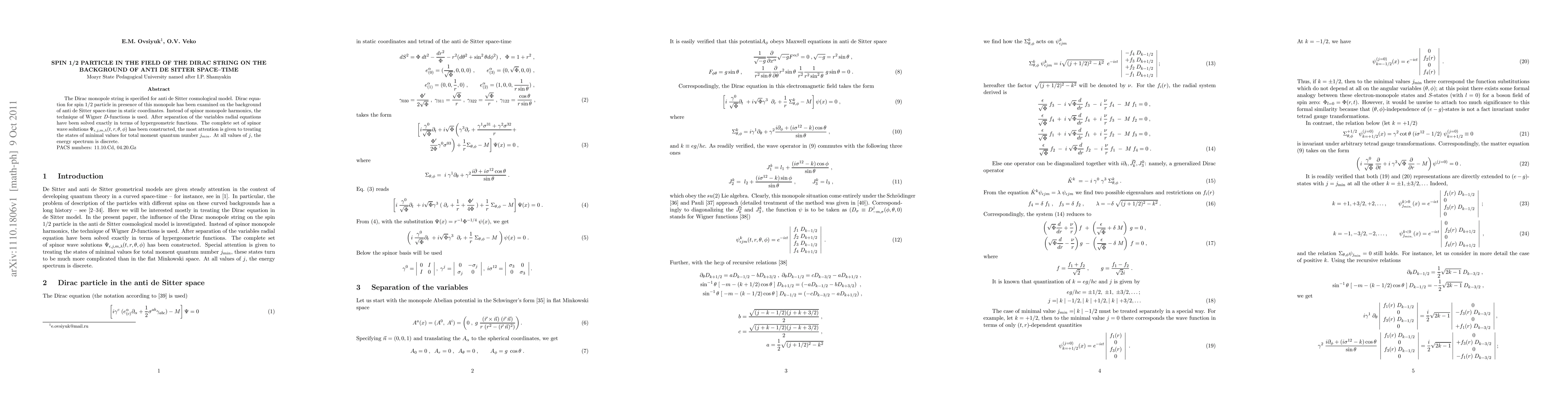The Dirac monopole string is specified for anti de Sitter cosmological model. Dirac equation for spin 1/2 particle in presence of this monopole has been examined on the background of anti de Sitter space-time in static coordinates. Instead of spinor monopole harmonics, the technique of Wigner D-functions is used. After separation of the variables radial equations have been solved exactly in terms of hypergeometric functions. The complete set of spinor wave solutions has been constructed, the most attention is given to treating the states of minimal values for total moment quantum number j_{min}. At all values of j, the energy spectrum is discrete.