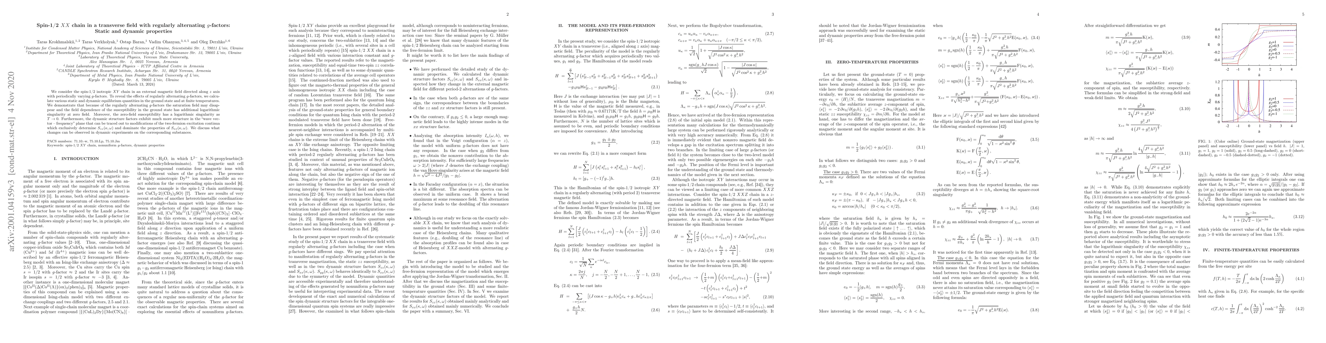 This paper investigates the spin-1/2 $XY$ chain under a transverse magnetic field with periodically alternating $g$-factors, revealing that such variations can eliminate saturation fields and introduce logarithmic singularities in susceptibility. The dynamic structure factors show enhanced complexity, linked to modifications in two-fermion excitation continua.