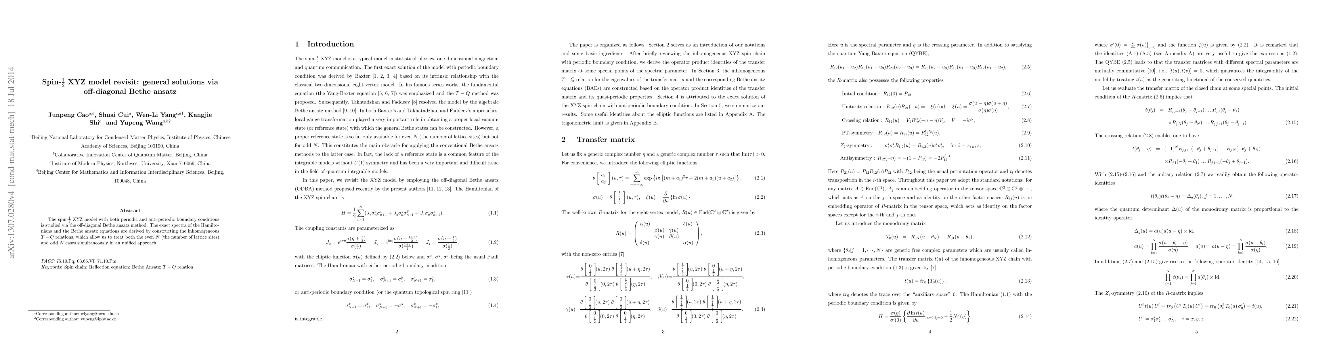 This paper derives the exact spectra and Bethe ansatz equations for the spin-1/2 XYZ model using the off-diagonal Bethe ansatz method, providing a unified approach to handle both even and odd lattice site configurations through inhomogeneous T-Q relations.