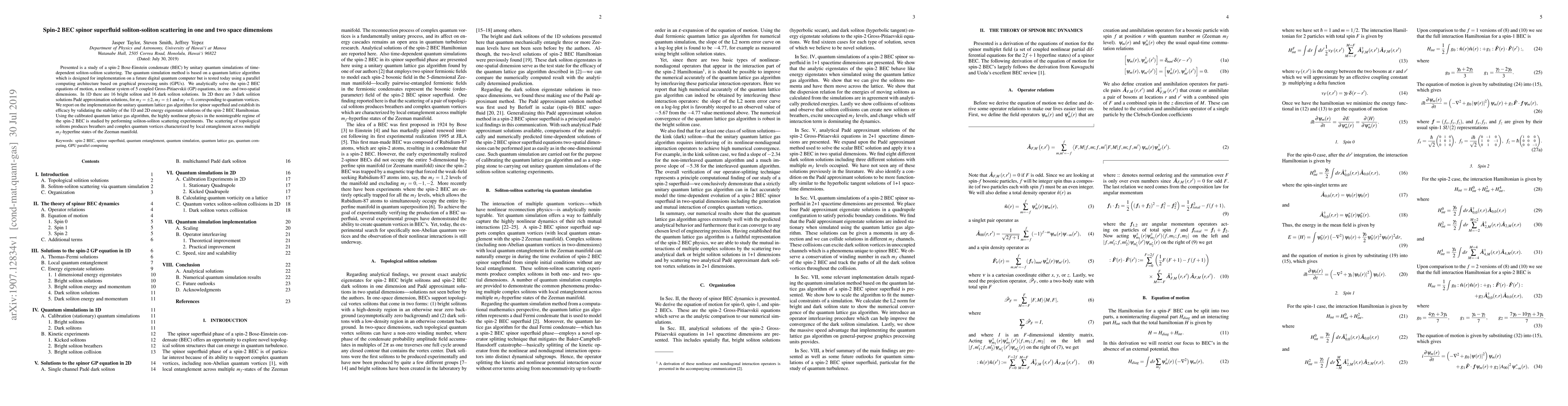This study investigates spin-2 Bose-Einstein condensates (BEC) using quantum simulations of soliton-soliton scattering in 1D and 2D, employing a quantum lattice algorithm tested on GPUs. The research reveals various soliton solutions and validates the stability of energy eigenstates, demonstrating complex scattering dynamics producing entangled quantum vortices.
