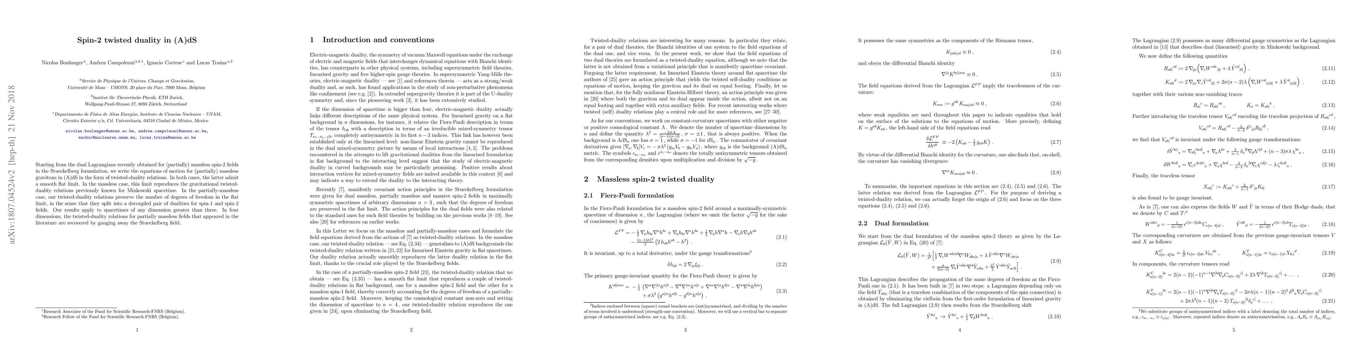 Starting from the dual Lagrangians recently obtained for (partially) massless spin-2 fields in the Stueckelberg formulation, we write the equations of motion for (partially) massless gravitons in (A)dS in the form of twisted-duality relations. In both cases, the latter admit a smooth flat limit. In the massless case, this limit reproduces the gravitational twisted-duality relations previously known for Minkowski spacetime. In the partially-massless case, our twisted-duality relations preserve the number of degrees of freedom in the flat limit, in the sense that they split into a decoupled pair of dualities for spin-1 and spin-2 fields. Our results apply to spacetimes of any dimension greater than three. In four dimensions, the twisted-duality relations for partially massless fields that appeared in the literature are recovered by gauging away the Stueckelberg field.