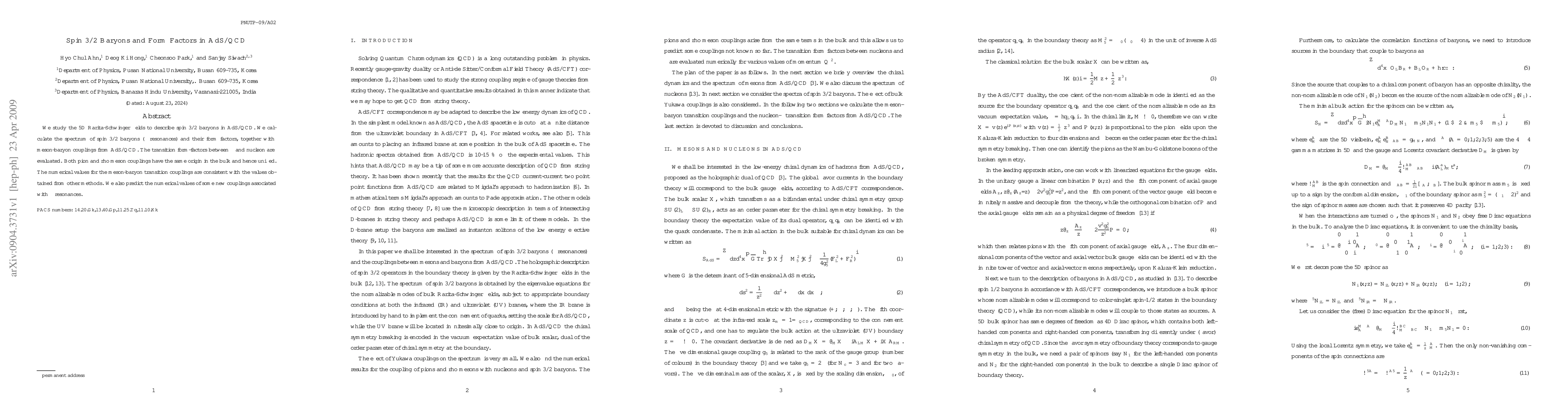 This paper investigates spin 3/2 baryons (Delta resonances) using 5D Rarita-Schwinger fields in the AdS/QCD framework, calculating their spectrum and form factors. It unifies pion and rho meson couplings and finds numerical consistency with other methods, while predicting new Delta resonance couplings.