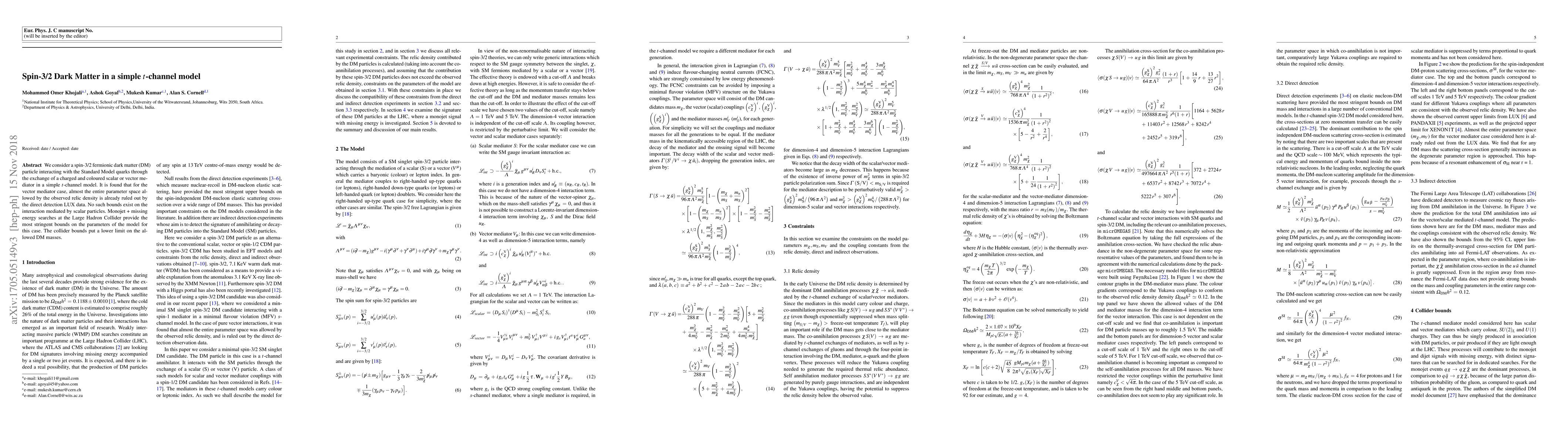 This paper explores a spin-3/2 fermionic dark matter model interacting with Standard Model quarks via a charged scalar or vector mediator in a $t$-channel. Vector mediators face strong constraints from LUX direct detection data, while scalar mediators do not, with collider searches providing the most stringent bounds on model parameters.