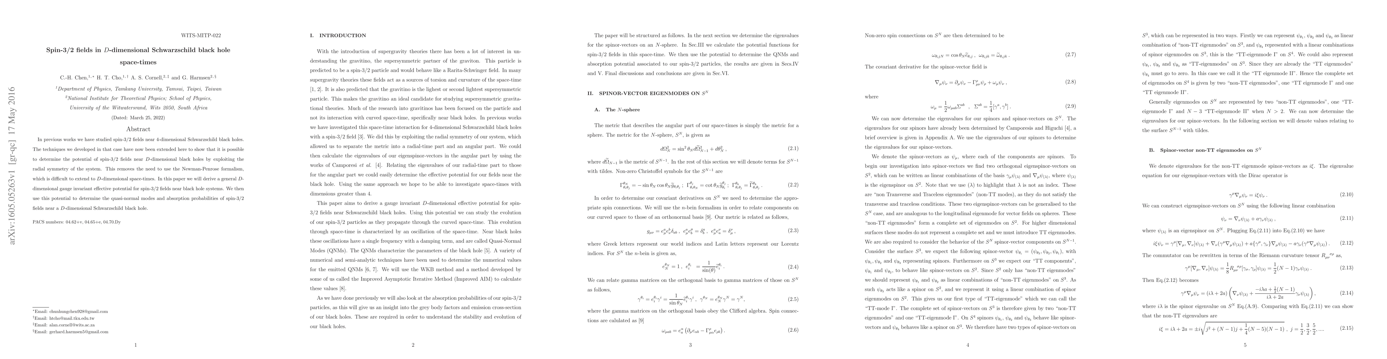This paper extends previous techniques to derive a $D$-dimensional gauge invariant effective potential for spin-3/2 fields near Schwarzschild black holes, bypassing the complexity of the Newman-Penrose formalism, and utilizes it to determine quasi-normal modes and absorption probabilities.