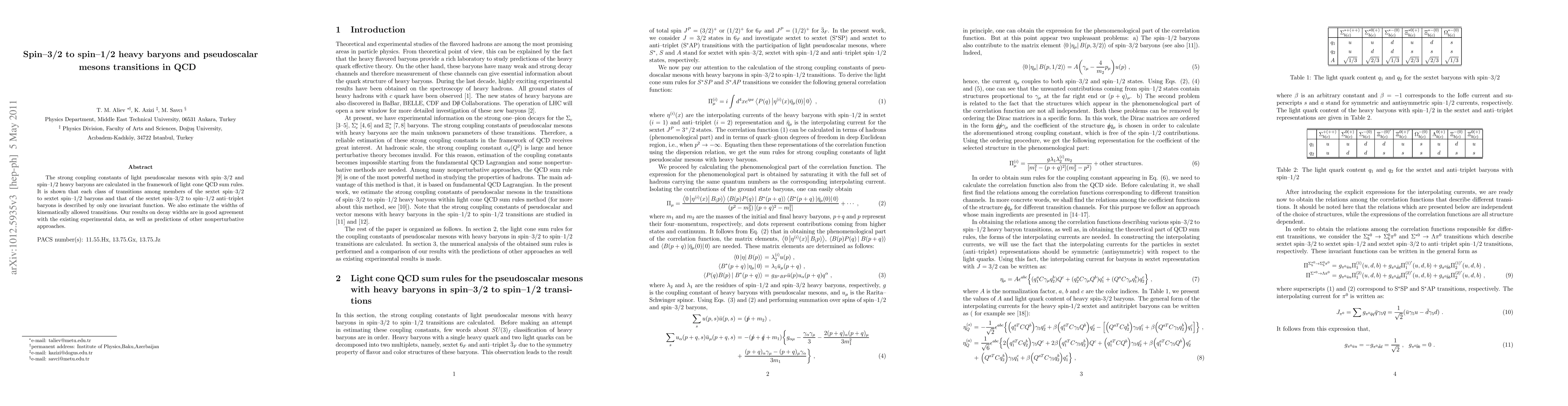 The strong coupling constants of light pseudoscalar mesons with spin--3/2 and spin--1/2 heavy baryons are calculated in the framework of light cone QCD sum rules. It is shown that each class of transitions among members of the sextet spin--3/2 to sextet spin--1/2 baryons and that of the sextet spin--3/2 to spin--1/2 anti--triplet baryons is described by only one invariant function. We also estimate the widths of kinematically allowed transitions. Our results on decay widths are in good agreement with the existing experimental data, as well as predictions of other nonperturbative approaches.