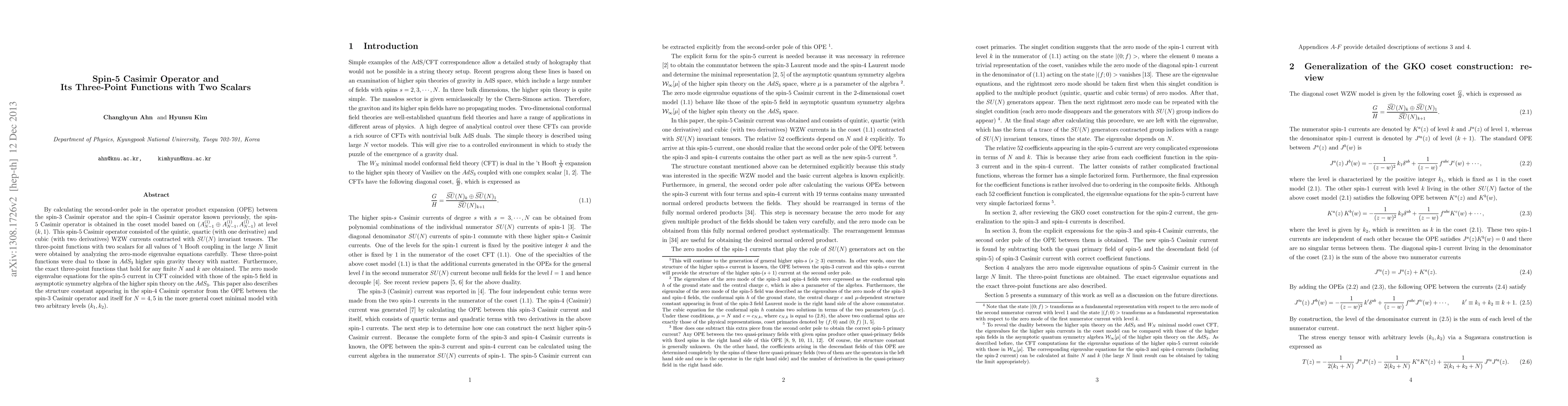 By calculating the second-order pole in the operator product expansion (OPE) between the spin-3 Casimir operator and the spin-4 Casimir operator known previously, the spin-5 Casimir operator is obtained in the coset model based on (A_{N-1}^{(1)} \oplus A_{N-1}^{(1)}, A_{N-1}^{(1)}) at level (k,1). This spin-5 Casimir operator consisted of the quintic, quartic (with one derivative) and cubic (with two derivatives) WZW currents contracted with SU(N) invariant tensors. The three-point functions with two scalars for all values of 't Hooft coupling in the large N limit were obtained by analyzing the zero-mode eigenvalue equations carefully. These three-point functions were dual to those in AdS_3 higher spin gravity theory with matter. Furthermore, the exact three-point functions that hold for any finite N and k are obtained. The zero mode eigenvalue equations for the spin-5 current in CFT coincided with those of the spin-5 field in asymptotic symmetry algebra of the higher spin theory on the AdS_3. This paper also describes the structure constant appearing in the spin-4 Casimir operator from the OPE between the spin-3 Casimir operator and itself for N=4, 5 in the more general coset minimal model with two arbitrary levels (k_1, k_2).