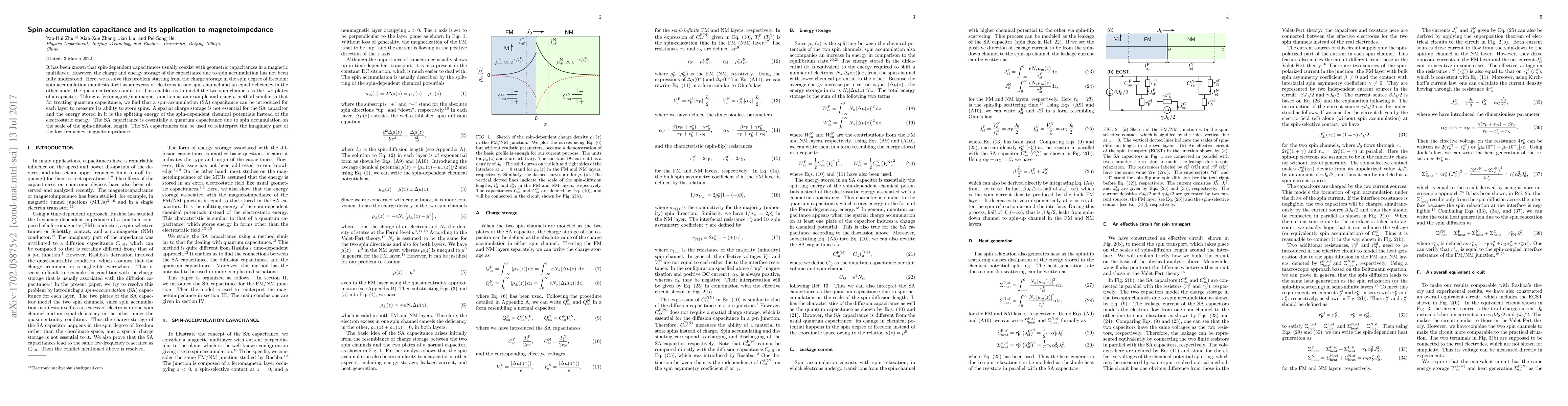 This paper explores the concept of spin-accumulation capacitance in magnetic multilayers, demonstrating that it arises due to the excess of electrons in one spin channel and a corresponding deficiency in the other. The study introduces a spin-accumulation capacitance to quantify spin storage, which can be used to reinterpret the low-frequency magnetoimpedance, providing a new perspective on spin-dependent charge storage.
