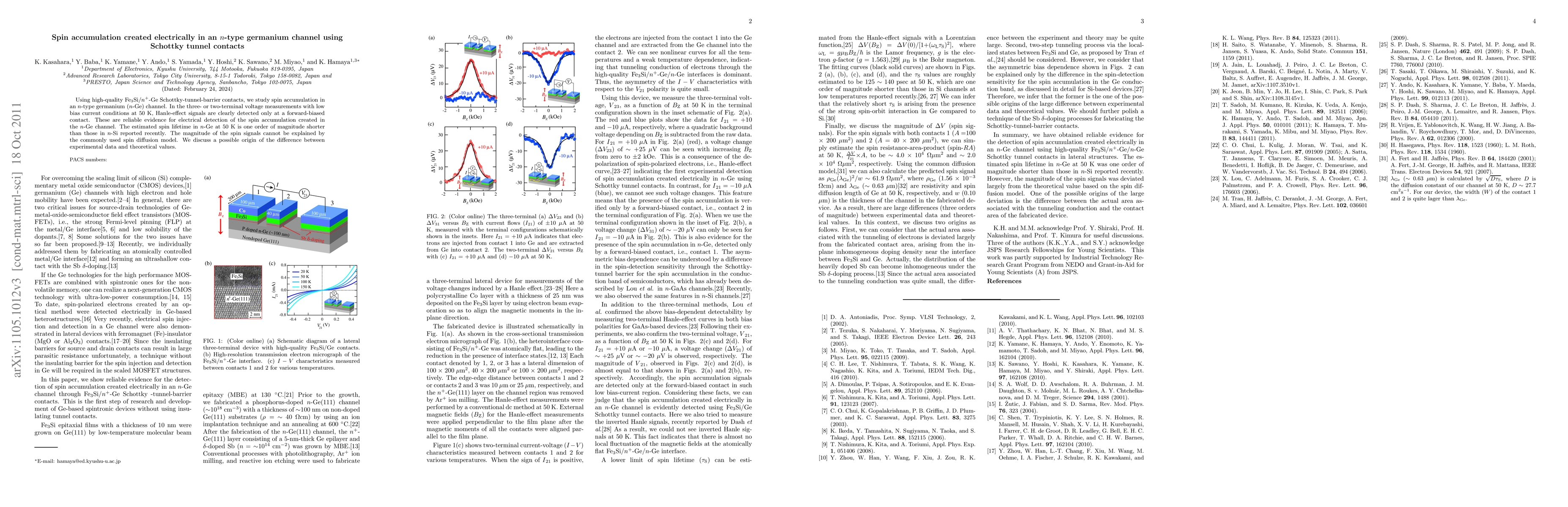 The study investigates spin accumulation in an n-type germanium channel via Fe$_3$Si/$n^+$-Ge Schottky tunnel contacts, revealing Hanle-effect signals under low bias at 50 K, indicating successful electrical detection. However, the spin lifetime in n-Ge is shorter than in n-Si, and the spin signals do not align with the spin diffusion model, prompting discussion on potential discrepancies.
