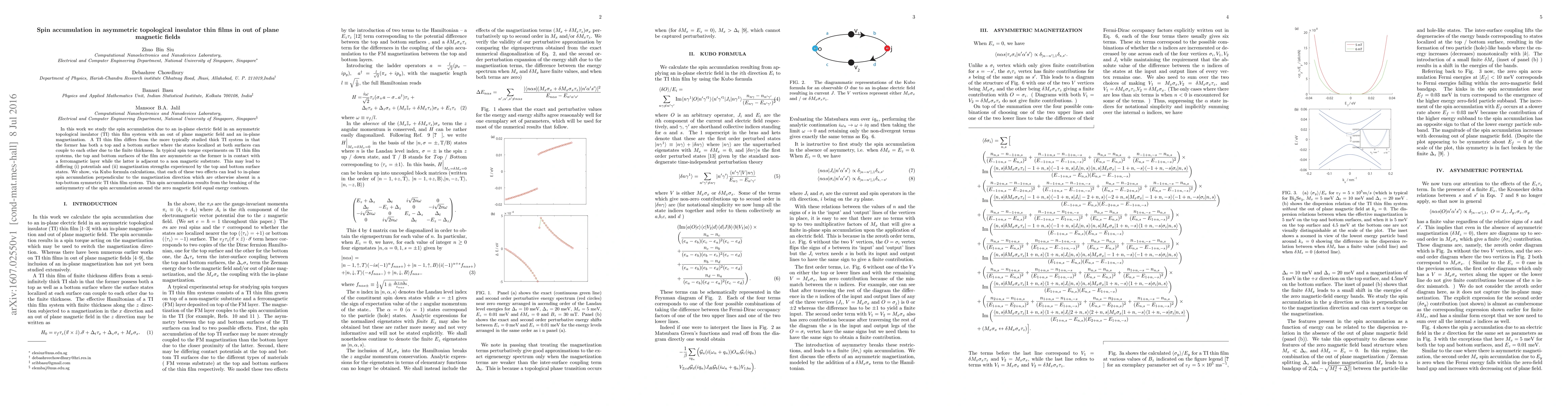 This paper investigates spin accumulation in asymmetric topological insulator thin films under an in-plane electric field and out-of-plane magnetic field. It demonstrates that the asymmetry between top and bottom surfaces leads to in-plane spin accumulation perpendicular to the magnetization, a phenomenon absent in symmetric systems.