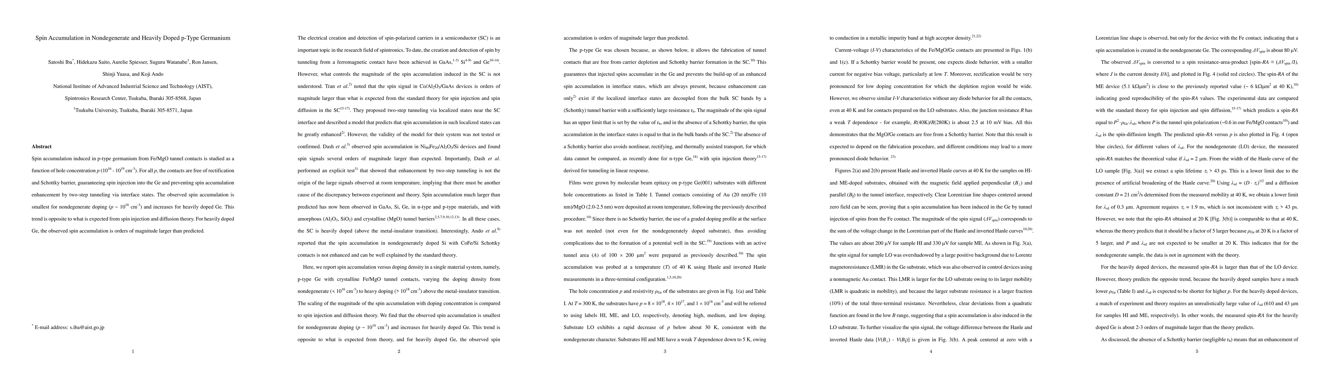 This study investigates spin accumulation in heavily doped p-type germanium via Fe/MgO tunnel contacts, revealing that spin accumulation is smallest at nondegenerate doping and increases significantly with higher doping levels, contrary to theoretical predictions. Heavily doped germanium shows spin accumulation orders of magnitude larger than expected.