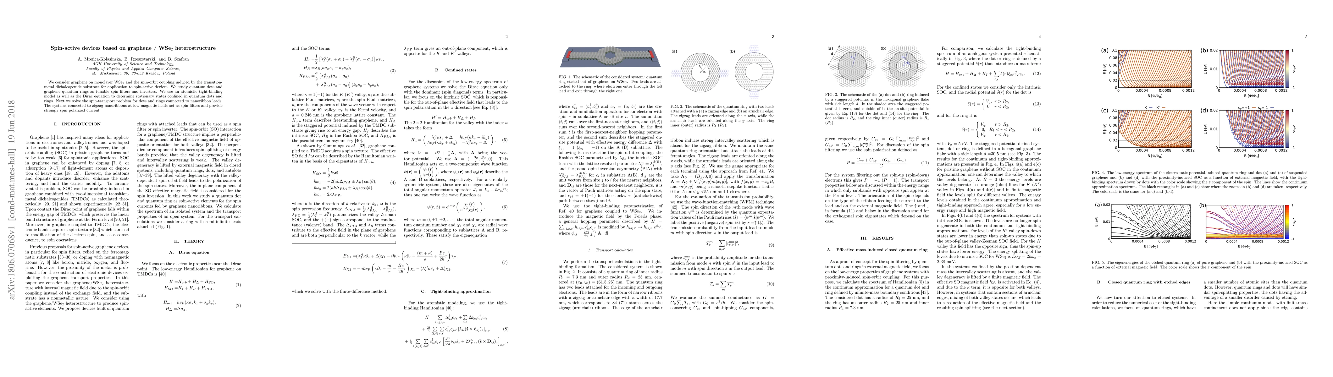 This paper explores spin-active devices based on graphene/WSe$_2$ heterostructures, focusing on quantum dots and graphene quantum rings as spin filters and inverters. It employs atomistic tight-binding and Dirac equation models to study spin-transport and finds that the systems connected to zigzag nanoribbons act as effective spin filters under low magnetic fields.