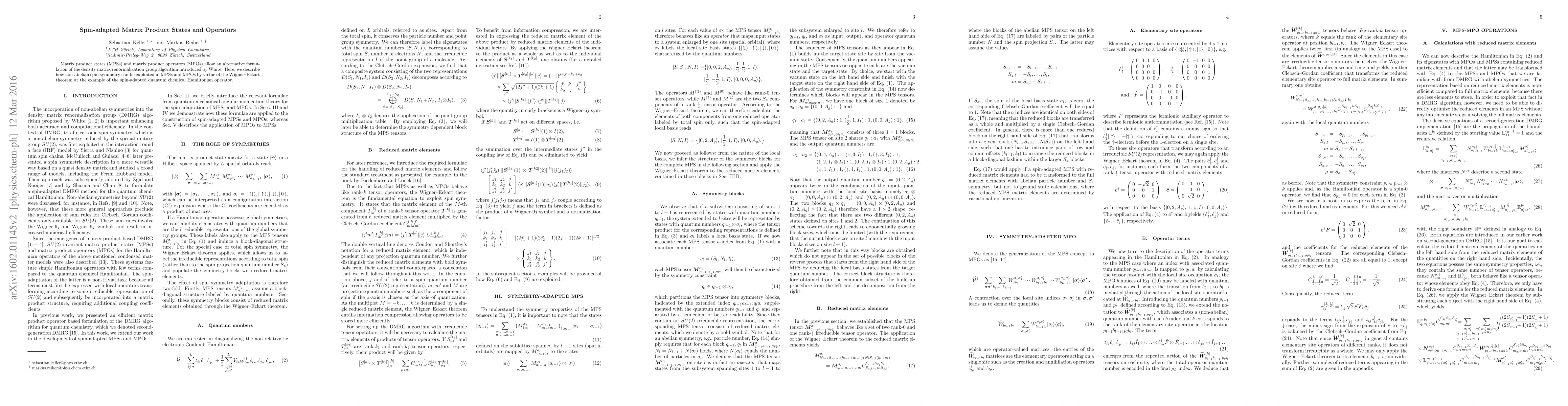 Summary: This paper explores the application of spin-adapted matrix product states (MPSs) and operators (MPOs) to exploit non-abelian spin symmetry, leveraging the Wigner-Eckart theorem, to reformulate the density matrix renormalization group algorithm for quantum chemical Hamiltonians.