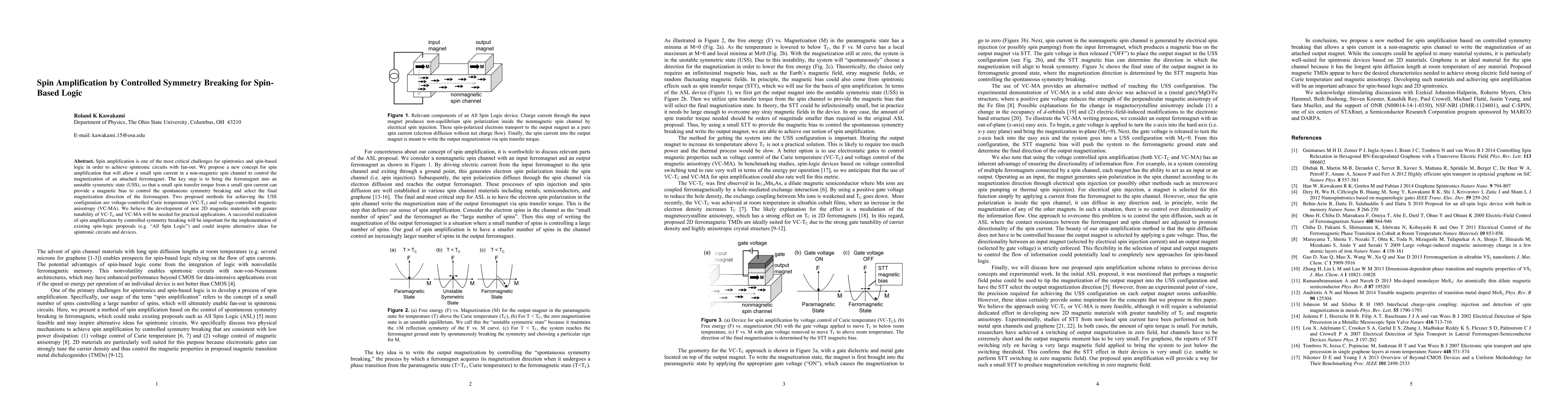 Spin amplification is one of the most critical challenges for spintronics and spin-based logic in order to achieve spintronic circuits with fan-out. We propose a new concept for spin amplification that will allow a small spin current in a non-magnetic spin channel to control the magnetization of an attached ferromagnet. The key step is to bring the ferromagnet into an unstable symmetric state (USS), so that a small spin transfer torque from a small spin current can provide a magnetic bias to control the spontaneous symmetry breaking and select the final magnetization direction of the ferromagnet. Two proposed methods for achieving the USS configuration are voltage-controlled Curie temperature (VC-TC) and voltage-controlled magnetic anisotropy (VC-MA). We believe the development of new 2D magnetic materials with greater tunability of VC-TC and VC-MA will be needed for practical applications. A successful realization of spin amplification by controlled symmetry breaking will be important for the implementation of existing spin-logic proposals (e.g. "All Spin Logic") and could inspire alternative ideas for spintronic circuits and devices.