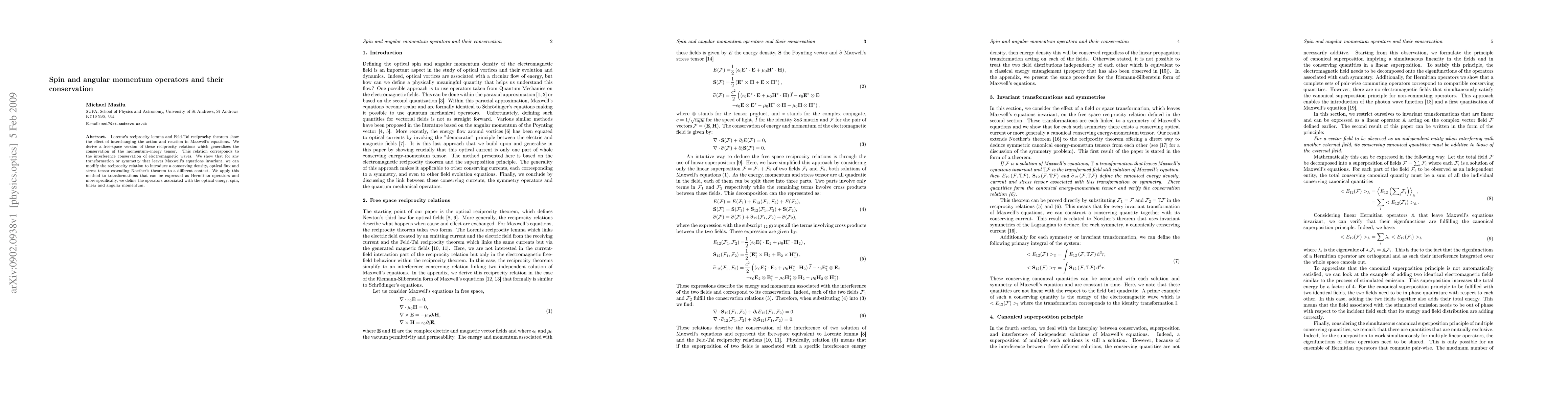 This paper derives a generalized reciprocity relation in free space that extends the conservation of the momentum-energy tensor to include optical flux and stress tensor. It introduces the conservation of spin and angular momentum operators, extending Noether's theorem to electromagnetic wave transformations.