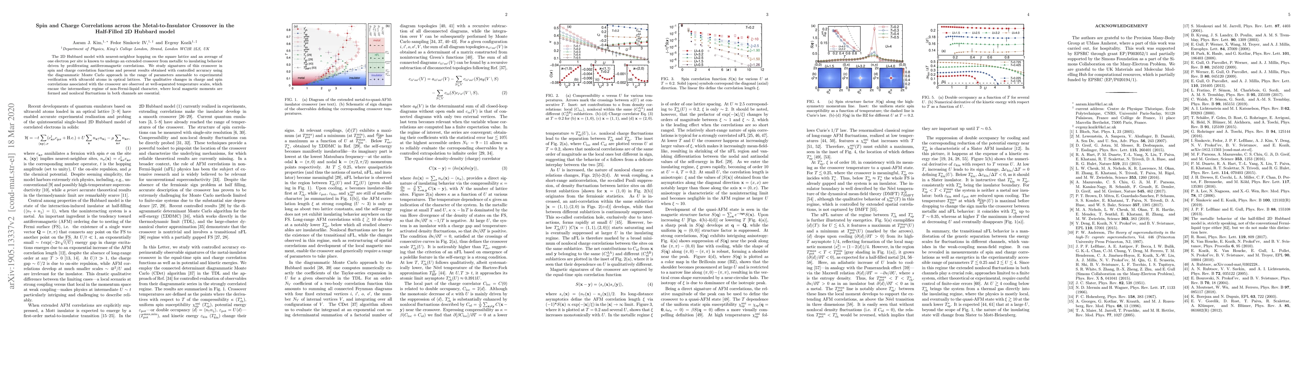 This paper investigates the metal-to-insulator transition in the half-filled 2D Hubbard model using diagrammatic Monte Carlo, revealing distinct temperature scales for changes in spin and charge correlations. The study highlights the formation of local magnetic moments and non-local fluctuations during the crossover.