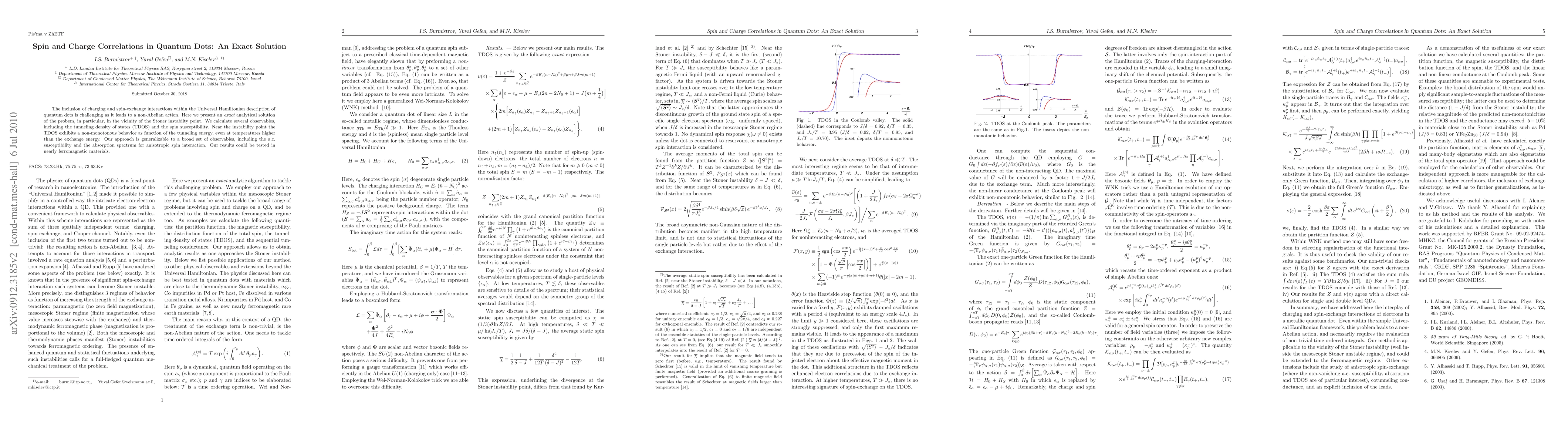 The inclusion of charging and spin-exchange interactions within the Universal Hamiltonian description of quantum dots is challenging as it leads to a non-Abelian action. Here we present an {\it exact} analytical solution of the probem, in particular, in the vicinity of the Stoner instabilty point. We calculate several observables, including the tunneling density of states (TDOS) and the spin susceptibility. Near the instability point the TDOS exhibits a non-monotonous behavior as function of the tunneling energy, even at temperatures higher than the exchange energy. Our approach is generalizable to a broad set of observables, including the a.c. susceptibility and the absorption spectrum for anisotropic spin interaction. Our results could be tested in nearly ferromagnetic materials.