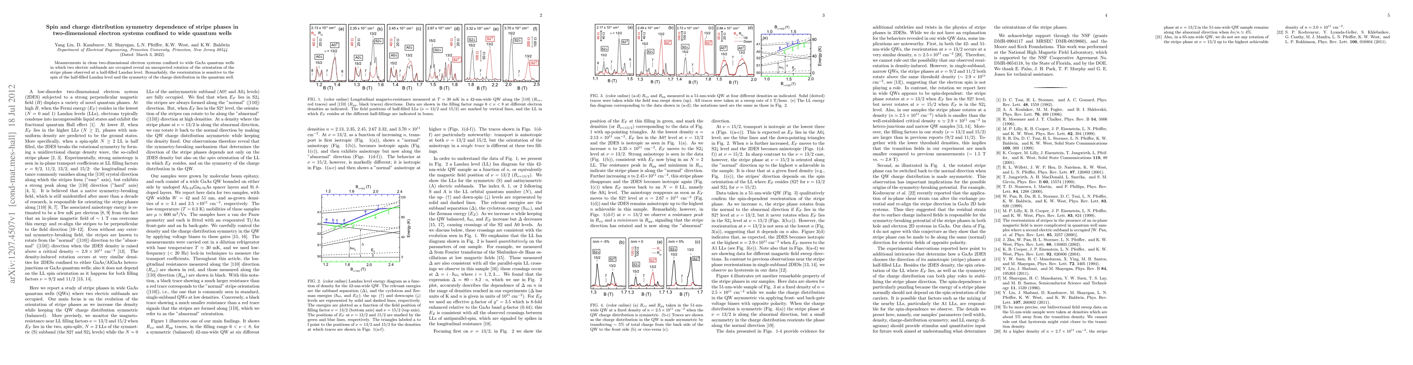 This paper investigates the orientation of stripe phases in two-dimensional electron systems in wide GaAs quantum wells, finding that the stripe orientation rotates unexpectedly at half-filled Landau levels, with this rotation being influenced by the spin orientation and the symmetry of the charge distribution.