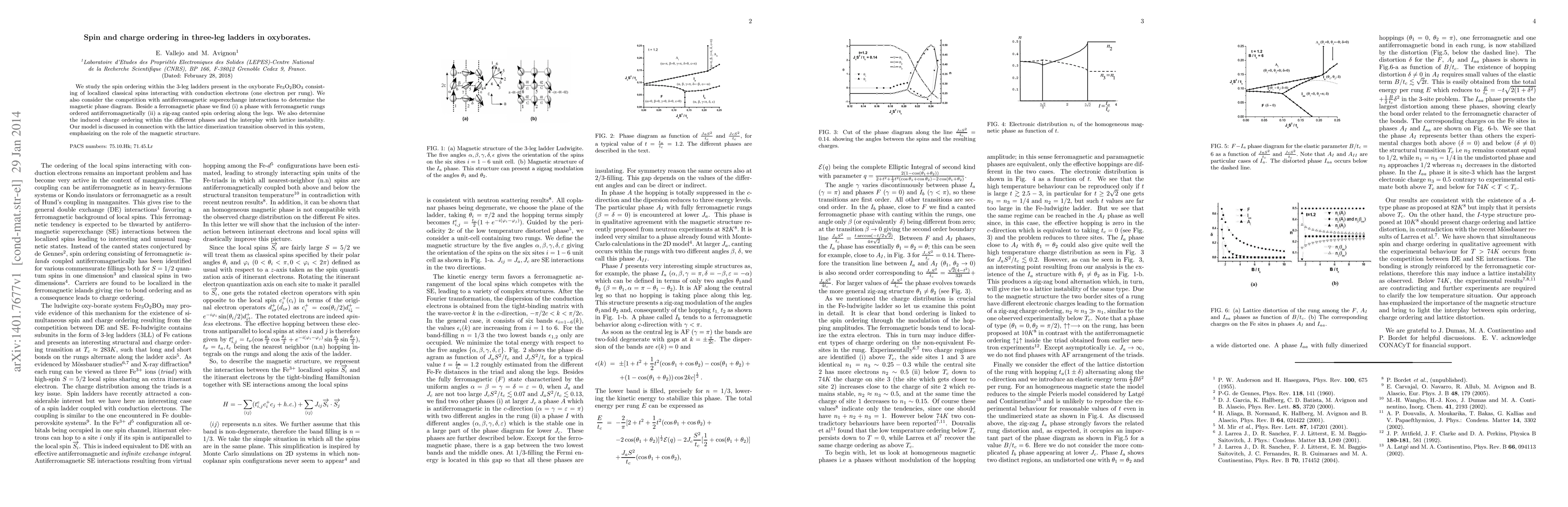 We study the spin ordering within the 3-leg ladders present in the oxyborate Fe(3)O(2)BO(3) consisting of localized classical spins interacting with conduction electrons (one electron per rung). We also consider the competition with antiferromagnetic superexchange interactions to determine the magnetic phase diagram. Beside a ferromagnetic phase we find (i) a phase with ferromagnetic rungs ordered antiferromagnetically (ii) a zig-zag canted spin ordering along the legs. We also determine the induced charge ordering within the different phases and the interplay with lattice instability. Our model is discussed in connection with the lattice dimerization transition observed in this system, emphasizing on the role of the magnetic structure.
