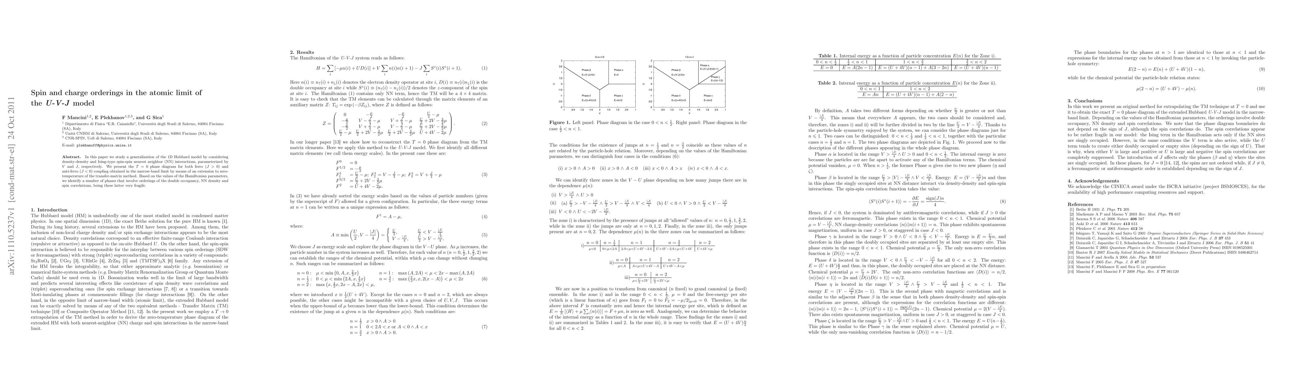 In this paper we study a generalization of the 1D Hubbard model by considering density-density and Ising-type spin-spin nearest neighbor (NN) interactions, parameterized by $V$ and $J$, respectively. We present the T=0 phase diagram for both ferro ($J>0$) and anti-ferro ($J<0$) coupling obtained in the narrow-band limit by means of an extension to zero-temperature of the transfer-matrix method. Based on the values of the Hamiltonian parameters, we identify a number of phases that involve orderings of the double occupancy, NN density and spin correlations, being these latter very fragile.