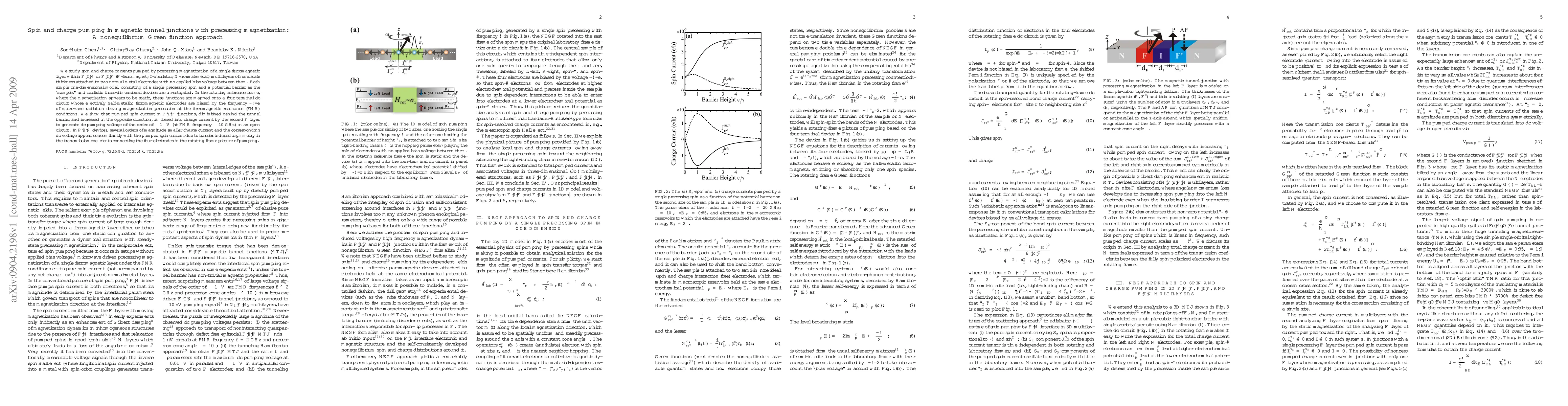 This paper investigates spin and charge currents generated by precessing magnetization in magnetic tunnel junctions using a nonequilibrium Green function approach. It demonstrates that F|I|F junctions can generate a dc pumping voltage of around 1 µV at FMR frequencies, while F|I|N devices show much smaller charge currents and voltages due to asymmetry in transmission coefficients.