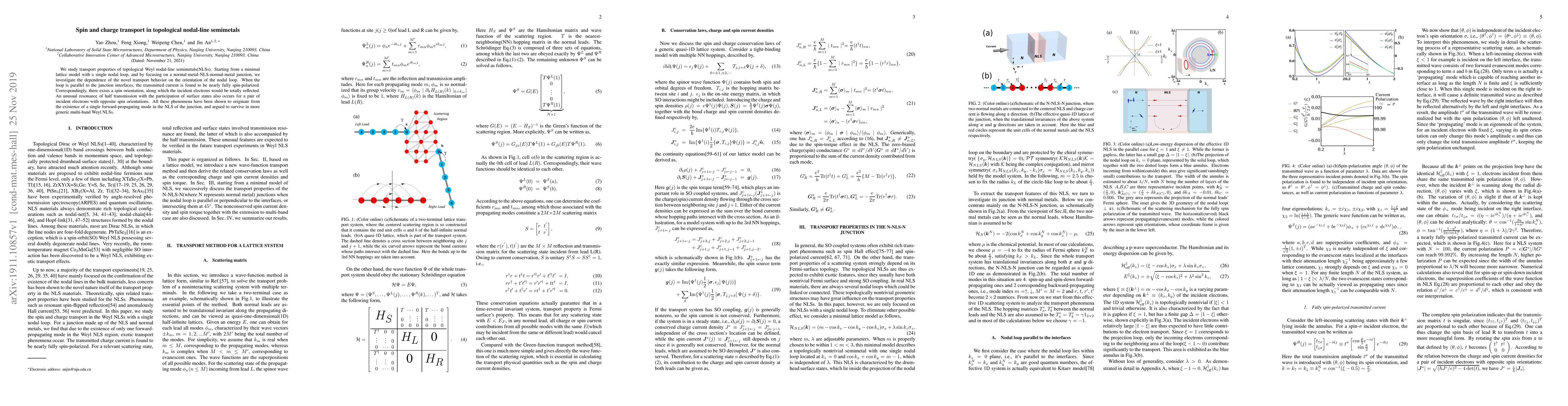 This research investigates spin and charge transport in topological nodal-line semimetals, revealing spin-polarized current and total reflection for certain spin orientations. It highlights a unique half transmission resonance for oppositely spin-paired electrons, attributed to a single forward-propagating mode in the junction.