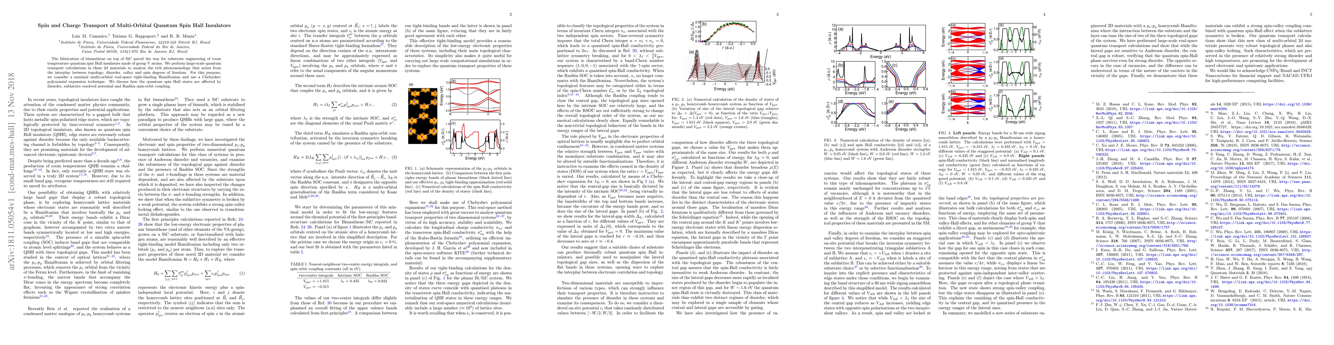 This paper investigates the spin and charge transport in multi-orbital quantum spin Hall insulators, specifically bismuthene on SiC, using quantum transport calculations. It explores the effects of disorder, sublattice potential, and Rashba spin-orbit coupling on these topological states.
