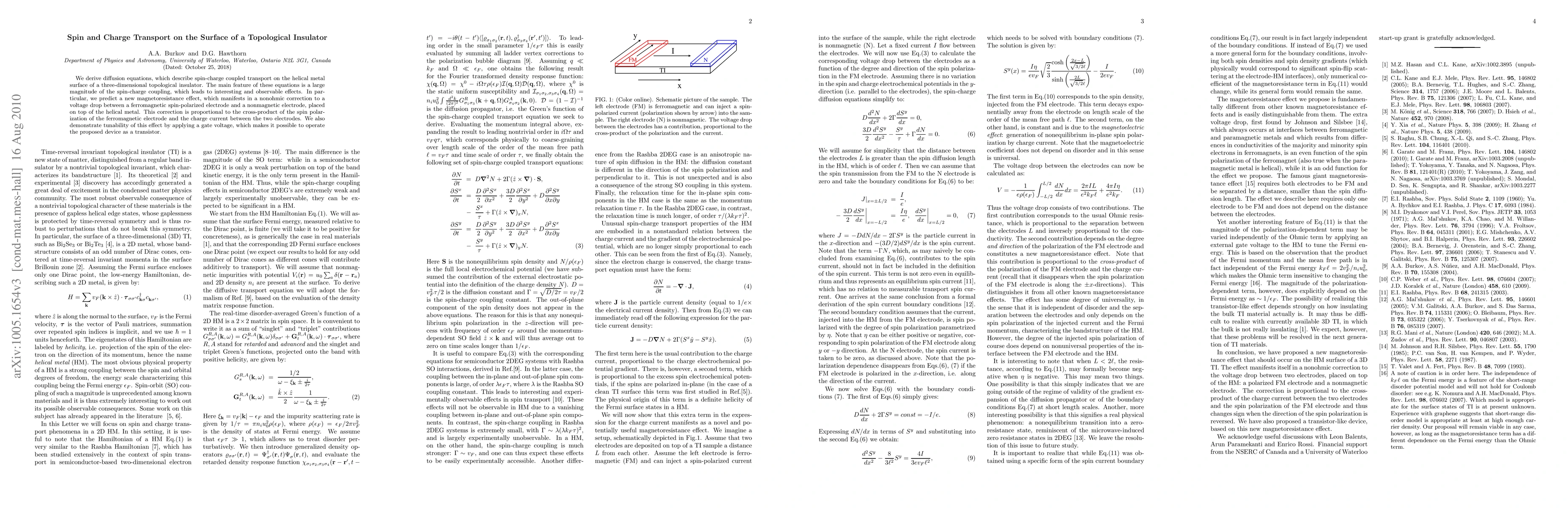 This paper derives diffusion equations for spin-charge coupled transport on the helical metal surface of a topological insulator, predicting a new magnetoresistance effect with a nonohmic voltage drop proportional to the spin polarization and charge current. The effect is tunable via gate voltage, enabling device operation as a transistor.