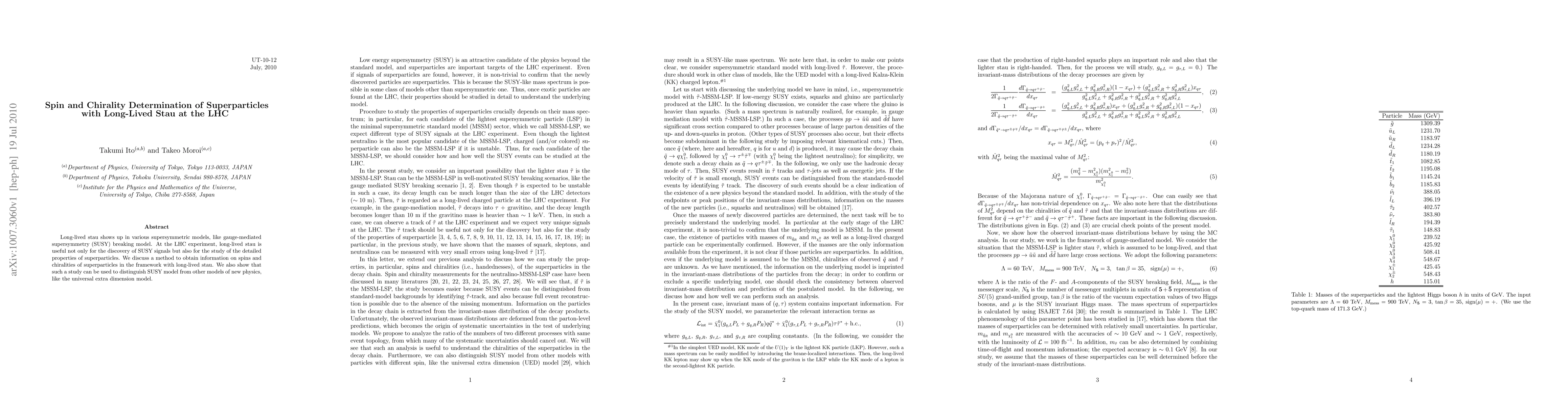 Long-lived stau shows up in various supersymmetric models, like gauge-mediated supersymmetry (SUSY) breaking model. At the LHC experiment, long-lived stau is useful not only for the discovery of SUSY signals but also for the study of the detailed properties of superparticles. We discuss a method to obtain information on spins and chiralities of superparticles in the framework with long-lived stau. We also show that such a study can be used to distinguish SUSY model from other models of new physics, like the universal extra dimension model.