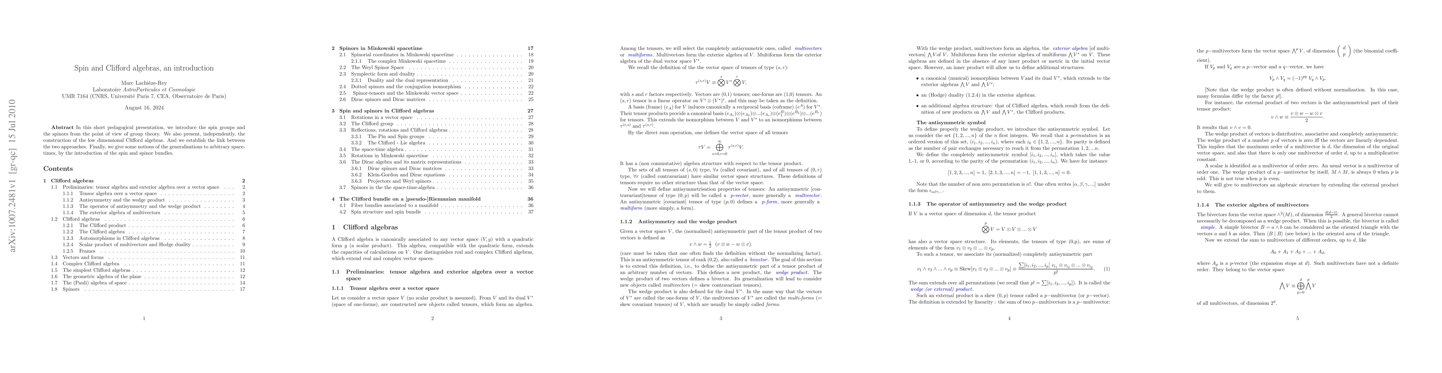 In this short pedagogical presentation, we introduce the spin groups and the spinors from the point of view of group theory. We also present, independently, the construction of the low dimensional Clifford algebras. And we establish the link between the two approaches. Finally, we give some notions of the generalisations to arbitrary spacetimes, by the introduction of the spin and spinor bundles.