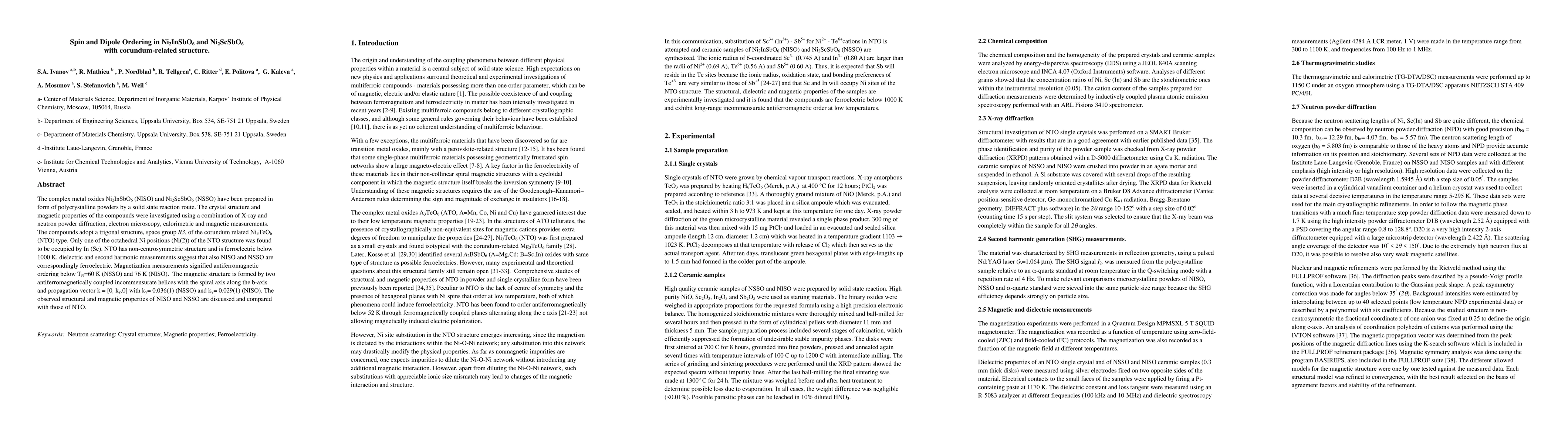 The complex metal oxides Ni2InSbO6 (NISO) and Ni2ScSbO6 (NSSO) have been prepared in form of polycrystalline powders by a solid state reaction route. The crystal structure and magnetic properties of the compounds were investigated using a combination of X-ray and neutron powder diffraction, electron microscopy, calorimetric and magnetic measurements. The compounds adopt a trigonal structure, space group R3, of the corundum related Ni3TeO6 (NTO) type. Only one of the octahedral Ni positions (Ni(2)) of the NTO structure was found to be occupied by In (Sc). NTO has non-centrosymmetric structure and is ferroelectric below 1000 K, dielectric and second harmonic measurements suggest that also NISO and NSSO are correspondingly ferroelectric. Magnetization measurements signified antiferromagnetic ordering below TN=60 K (NSSO) and 76 K (NISO). The magnetic structure is formed by two antiferromagnetically coupled incommensurate helices with the spiral axis along the b-axis and propagation vector k = [0, ky,0] with ky= 0.036(1) (NSSO) and ky= 0.029(1) (NISO). The observed structural and magnetic properties of NISO and NSSO are discussed and compared with those of NTO.