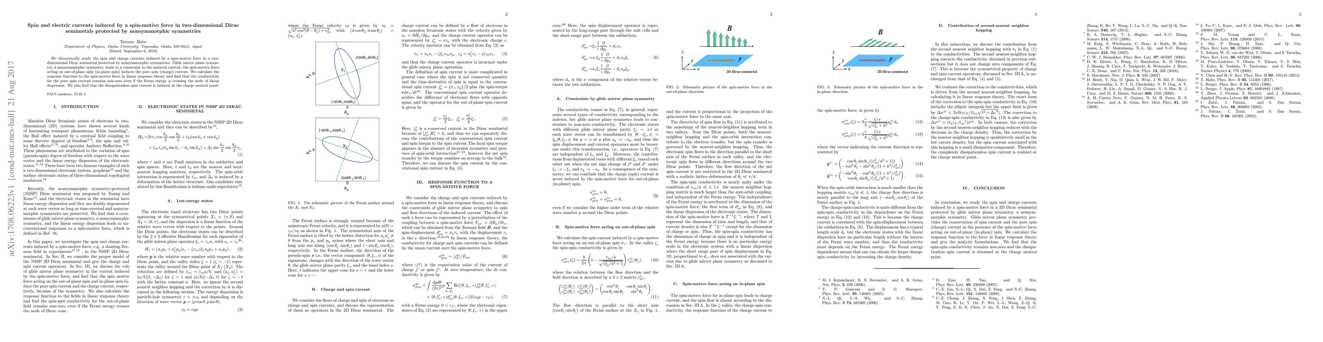 This paper theoretically investigates spin and charge currents in two-dimensional Dirac semimetals protected by nonsymmorphic symmetries, finding that a spin-motive force induces a pure spin current for out-of-plane spin and a charge current for in-plane spin, with the pure spin current remaining non-zero even when the Fermi energy crosses the node of linear dispersion.