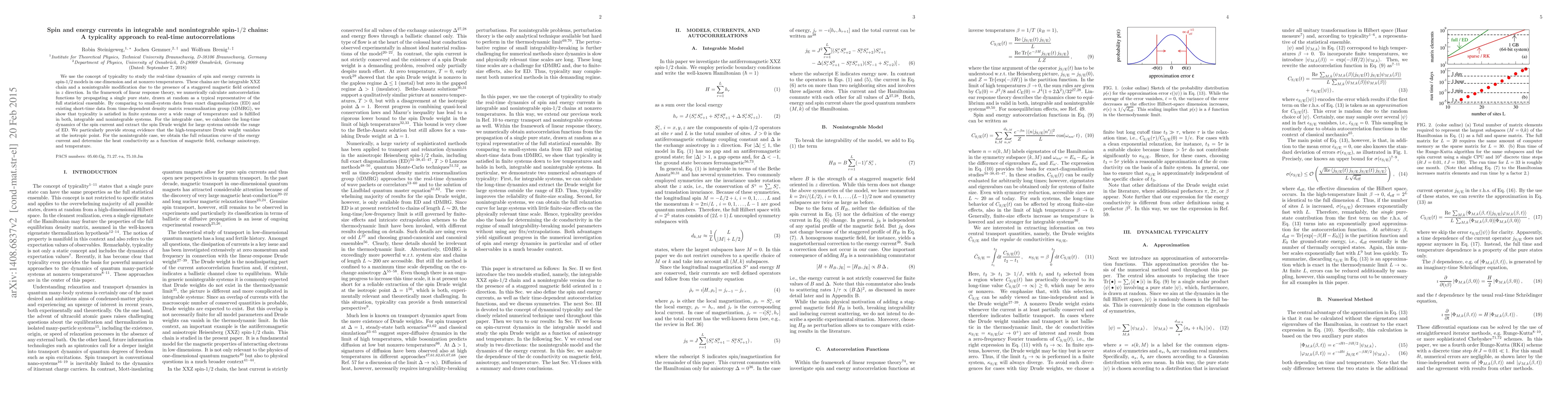This paper investigates the real-time dynamics of spin and energy currents in integrable and nonintegrable spin-1/2 chains using a typicality approach. It finds that typicality holds in both systems across various temperatures, and provides insights into the spin Drude weight and heat conductivity under different conditions.