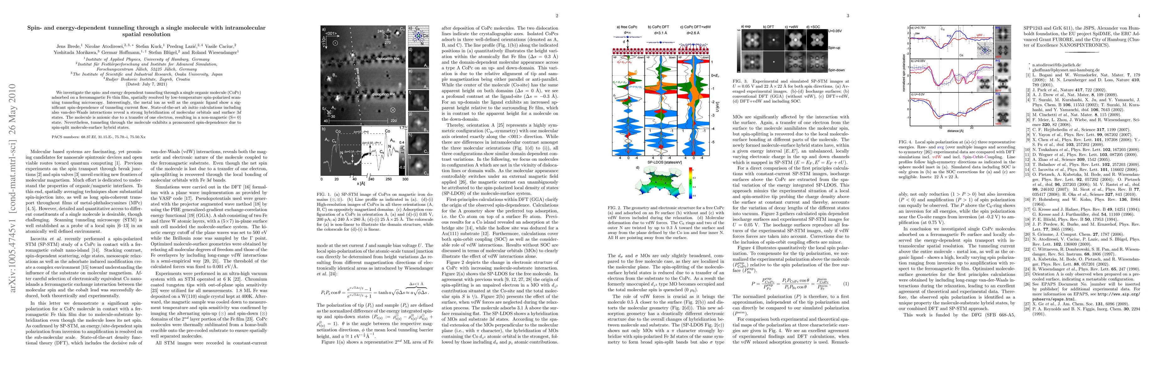 This research explores spin- and energy-dependent tunneling through a single organic molecule (CoPc) on a ferromagnetic Fe surface, revealing significant spin-dependence in both the metal ion and organic ligand. Ab initio calculations show strong hybridization of molecular orbitals and surface states, leading to a pronounced spin-dependence in tunneling despite the molecule being anionic and non-magnetic.