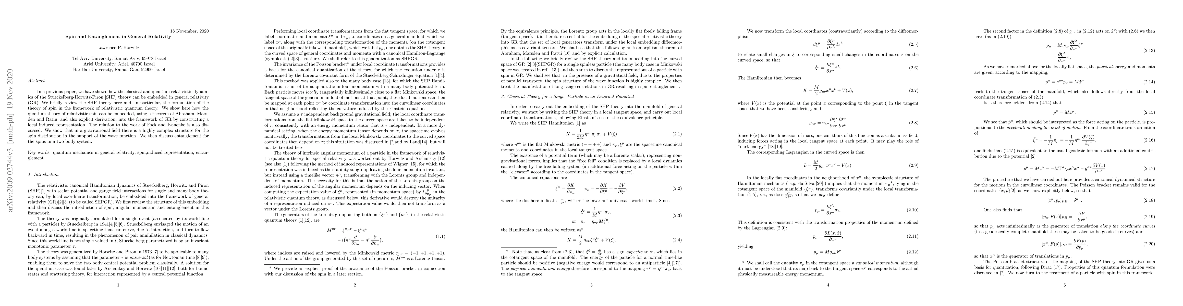 This paper reviews the embedding of the Stueckelberg-Horwitz-Piron (SHP) theory, which includes relativistic quantum dynamics and spin, into general relativity (GR). It constructs a local induced representation to integrate quantum spin theory within GR and discusses the complex spin distribution in gravitational fields, along with entanglement dynamics for two-body systems.