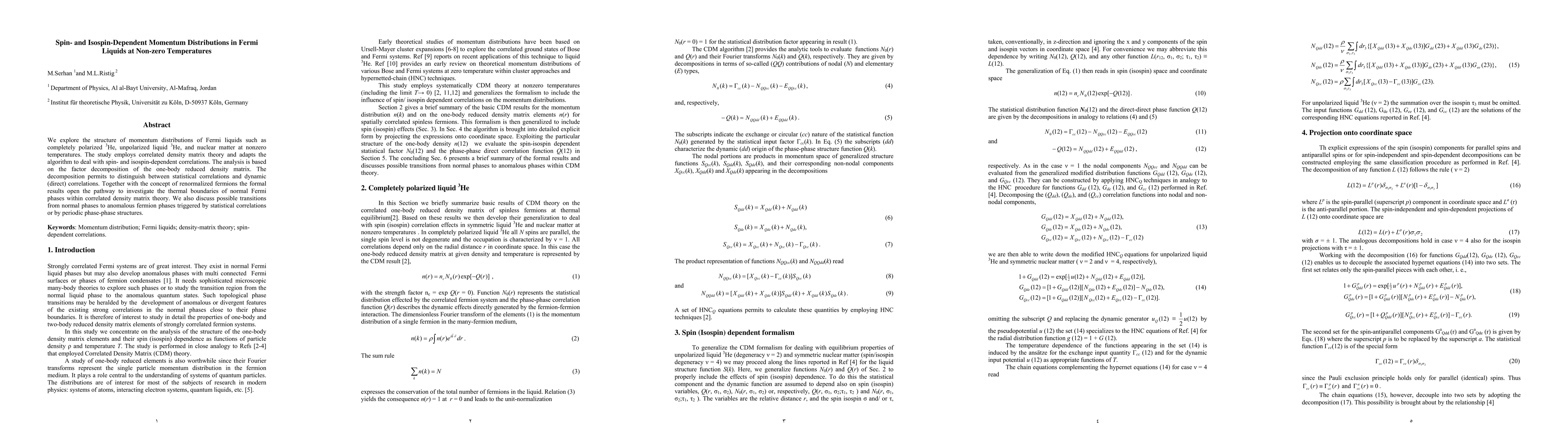 We explore the structure of momentum distributions of Fermi liquids such as completely polarized 3He, unpolarized liquid 3He, and nuclear matter at nonzero temperatures. The study employs correlated density matrix theory and adapts the algorithm to deal with spin- and isospin-dependent correlations. The analysis is based on the factor decomposition of the one-body reduced density matrix. The decomposition permits to distinguish between statistical correlations and dynamic (direct) correlations. Together with the concept of renormalized fermions the formal results open the pathway to investigate the thermal boundaries of normal Fermi phases within correlated density matrix theory. We also discuss possible transitions from normal phases to anomalous fermion phases triggered by statistical correlations or by periodic phase-phase structures.