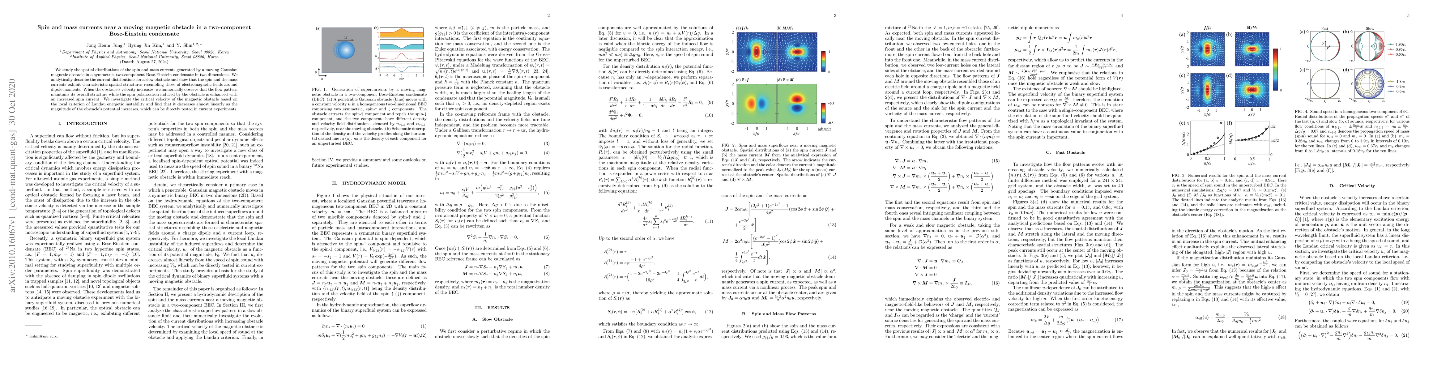 Researchers studied how a moving magnetic obstacle affects two-component Bose-Einstein condensate flow, finding that spin and mass currents exhibit patterns similar to electromagnetic fields around dipole moments.