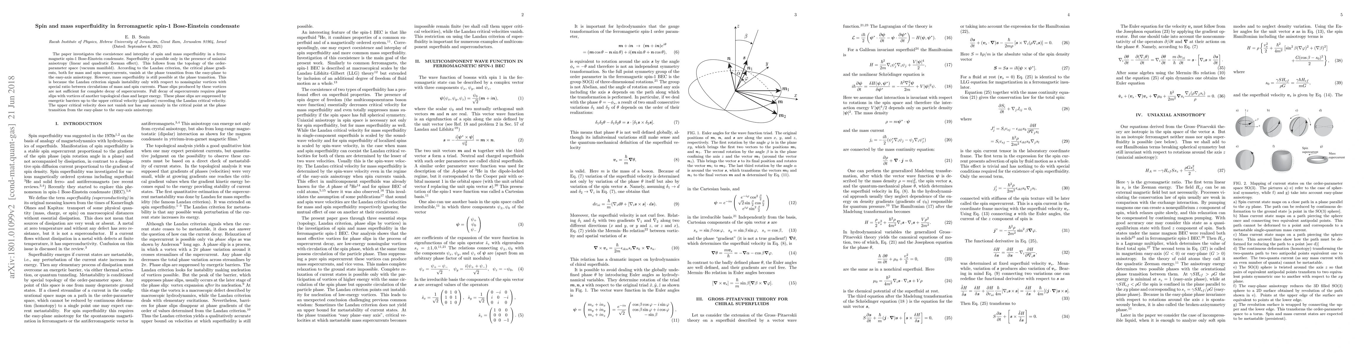 The paper explores the coexistence of spin and mass superfluidity in a ferromagnetic spin-1 Bose-Einstein condensate, revealing that both superfluidities persist despite the phase transition from easy-plane to easy-axis anisotropy, due to energetic barriers preventing the decay of supercurrents. The upper critical velocity remains non-zero and unaffected at the phase transition.
