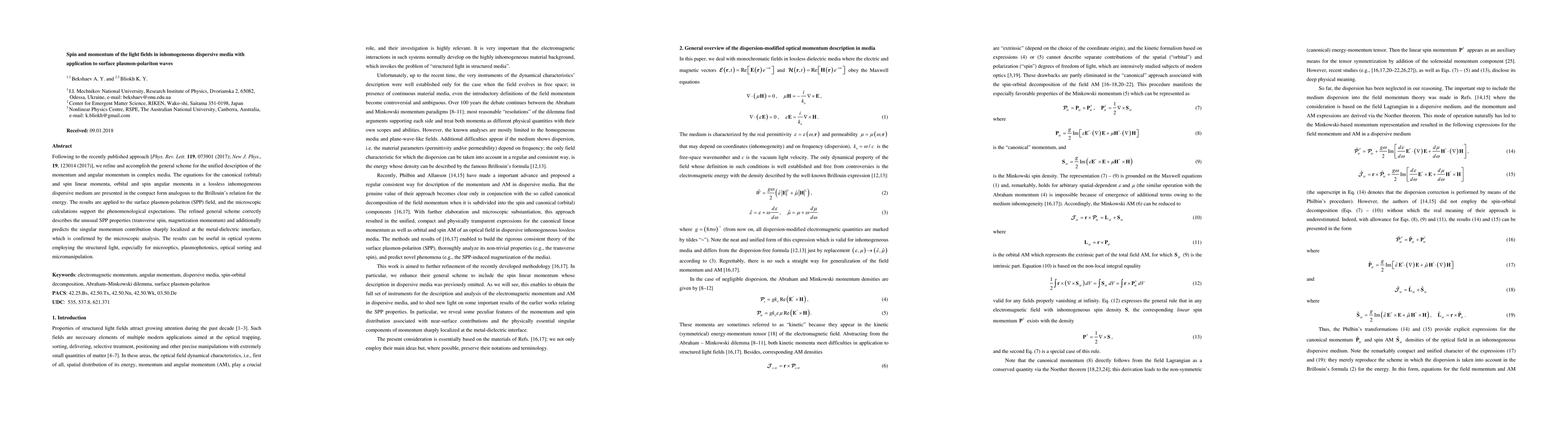 Following to the recently published approach [Phys. Rev. Lett. 119, 073901 (2017); New J. Phys., 123014 (2017)], we refine and accomplish the general scheme for the unified description of the momentum and angular momentum in complex media. The equations for the canonical (orbital) and spin linear momenta, orbital and spin angular momenta in a lossless inhomogeneous dispersive medium are presented in the compact form analogous to the Brillouin's relation for the energy. The results are applied to the surface plasmon-polariton (SPP) field, and the microscopic calculations support the phenomenological expectations. The refined general scheme correctly describes the unusual SPP properties (transverse spin, magnetization momentum) and additionally predicts the singular momentum contribution sharply localized at the metal-dielectric interface, which is confirmed by the microscopic analysis. The results can be useful in optical systems employing the structured light, especially for microoptics, plasmophotonics, optical sorting and micromanipulation.
