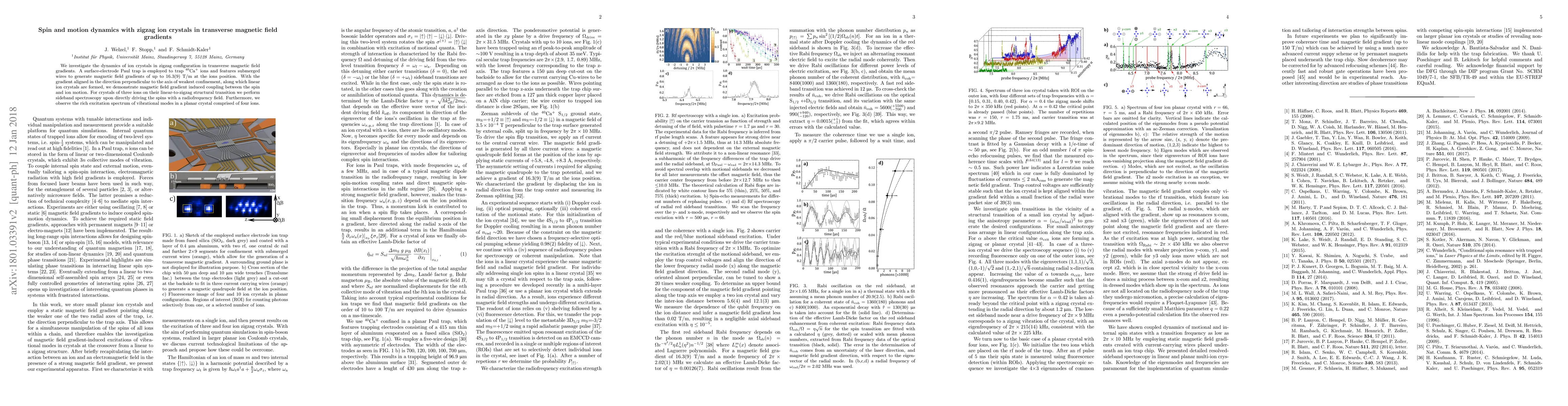 This paper explores the coupling between spin and motion dynamics in zigzag ion crystals subjected to transverse magnetic field gradients, using a Paul trap with submerged wires to generate these gradients. The study reveals a magnetic field gradient-induced interaction between spin and ion motion, and investigates the vibrational modes in a four-ion planar crystal through sideband spectroscopy.