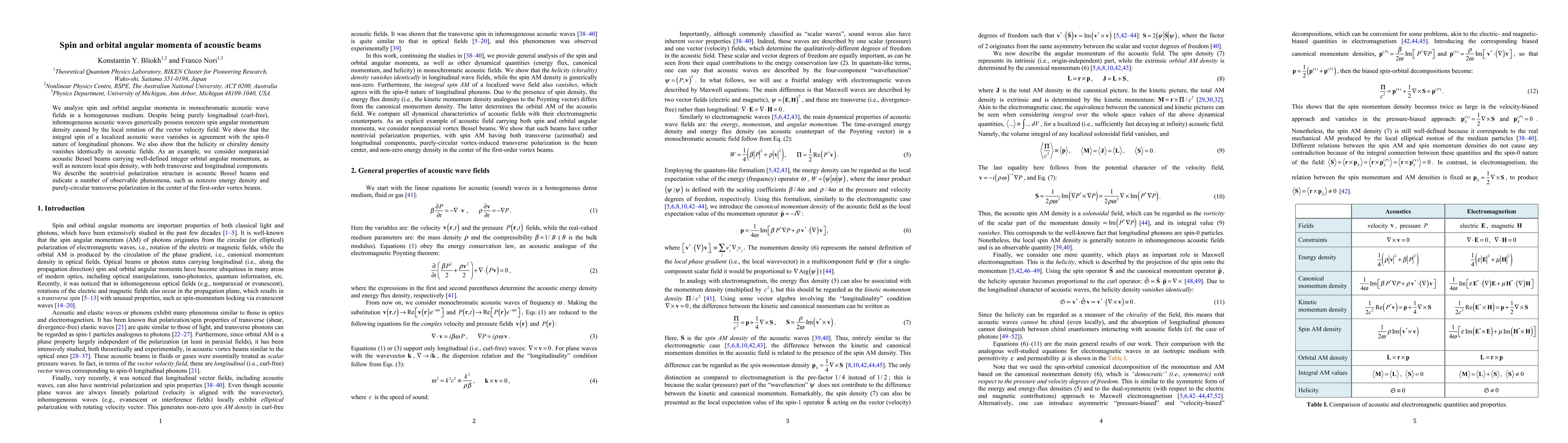 This paper explores the spin and orbital angular momenta in monochromatic acoustic waves, revealing that despite their longitudinal nature, they possess non-zero spin angular momentum density due to local velocity field rotations. It concludes that localized acoustic waves have zero integral spin and zero helicity, while highlighting the orbital angular momentum in nonparaxial Bessel beams.