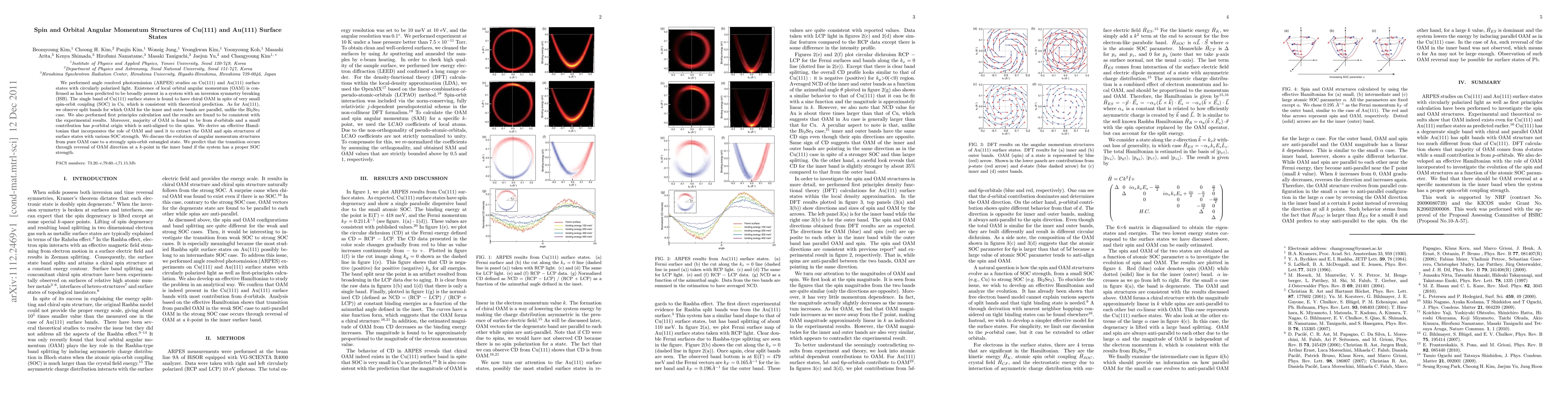 We performed angle resolved photoemission (ARPES) studies on Cu(111) and Au(111) surface states with circularly polarized light. Existence of local orbital angular momentum (OAM) is confirmed as has been predicted to be broadly present in a system with an inversion symmetry breaking (ISB). The single band of Cu(111) surface states is found to have chiral OAM in spite of very small spin-orbit coupling (SOC) in Cu, which is consistent with theoretical prediction. As for Au(111), we observe split bands for which OAM for the inner and outer bands are parallel, unlike the Bi2Se3 case. We also performed first principles calculation and the results are found to be consistent with the experimental results. Moreover, majority of OAM is found to be from d-orbitals and a small contribution has p-orbital origin which is anti-aligned to the spins. We derive an effective Hamiltonian that incorporates the role of OAM and used it to extract the OAM and spin structures of surface states with various SOC strength. We discuss the evolution of angular momentum structures from pure OAM case to a strongly spin-orbit entangled state. We predict that the transition occurs through reversal of OAM direction at a k-point in the inner band if the system has a proper SOC strength.