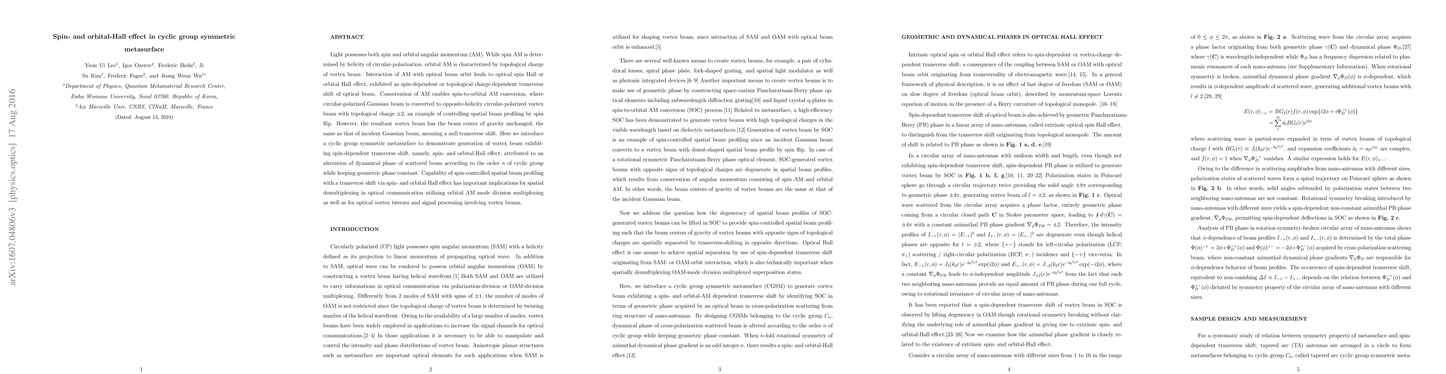 This paper demonstrates the spin- and orbital-Hall effect using a cyclic group symmetric metasurface, enabling spin-dependent transverse shifts in vortex beams. The metasurface alters the dynamical phase of scattered beams, leading to a transverse shift while maintaining a constant geometric phase, with significant implications for optical communication and signal processing.