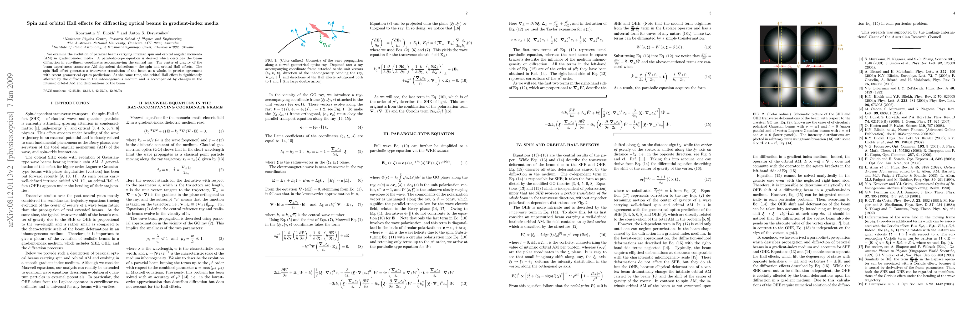 We examine the evolution of paraxial beams carrying intrinsic spin and orbital angular momenta (AM) in gradient-index media. A parabolic-type equation is derived which describes the beam diffraction in curvilinear coordinates accompanying the central ray. The center of gravity of the beam experiences transverse AM-dependent deflections -- the spin and orbital Hall effects. The spin Hall effect generates a transverse translation of the beam as a whole, in precise agreement with recent geometrical optics predictions. At the same time, the orbital Hall effect is significantly affected by the diffraction in the inhomogeneous medium and is accompanied by changes in the intrinsic orbital AM and deformations of the beam.