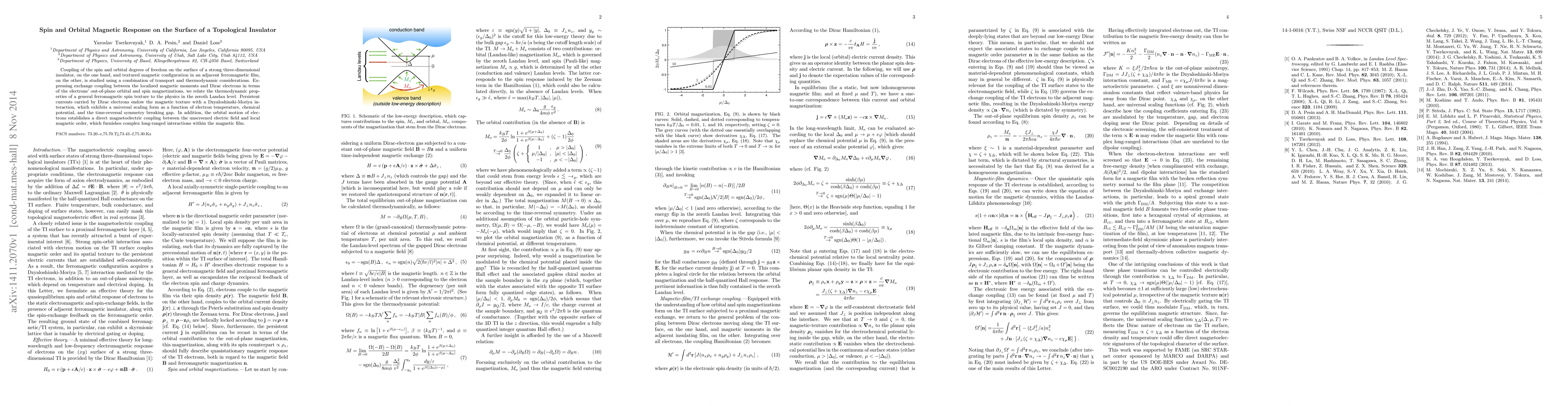 Coupling of the spin and orbital degrees of freedom on the surface of a strong three-dimensional insulator, on the one hand, and textured magnetic configuration in an adjacent ferromagnetic film, on the other, is studied using a combination of transport and thermodynamic considerations. Expressing exchange coupling between the localized magnetic moments and Dirac electrons in terms of the electrons' out-of-plane orbital and spin magnetizations, we relate the thermodynamic properties of a general ferromagnetic spin texture to the physics in the zeroth Landau level. Persistent currents carried by Dirac electrons endow the magnetic texture with a Dzyaloshinski-Moriya interaction, which exhibits a universal scaling form as a function of electron temperature, chemical potential, and the time-reversal symmetry breaking gap. In addition, the orbital motion of electrons establishes a direct magnetoelectric coupling between the unscreened electric field and local magnetic order, which furnishes complex long-ranged interactions within the magnetic film.