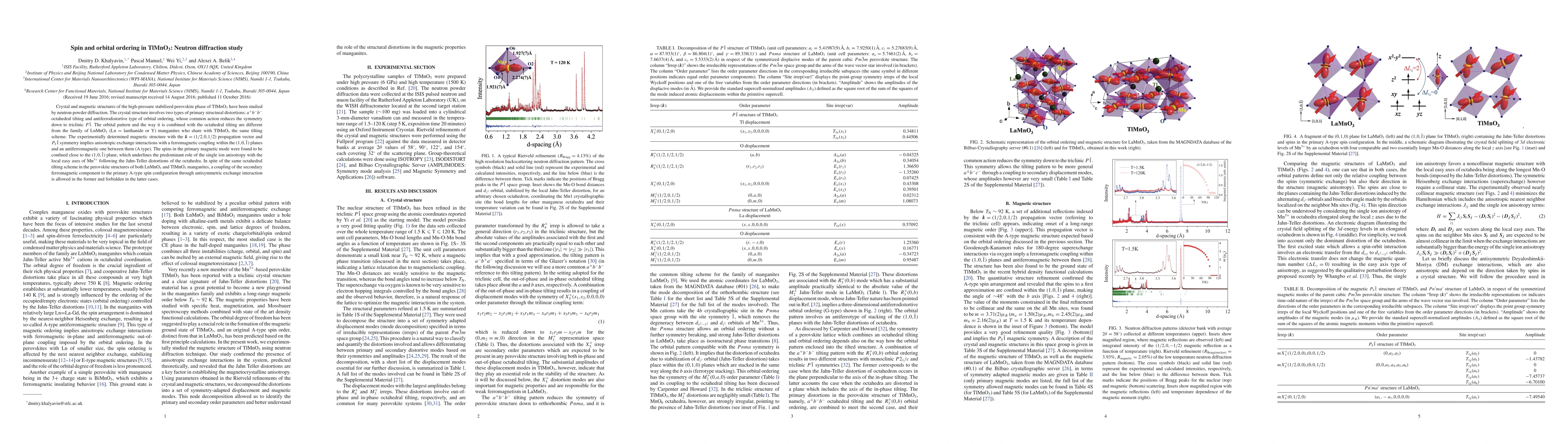 Crystal and magnetic structures of the high-pressure stabilized perovskite phase of TlMnO3 have been studied by neutron powder diffraction. The crystal structure involves two types of primary structural distortions: a+b-b-octahedral tilting and antiferrodistortive type of orbital ordering, whose common action reduces the symmetry down to triclinic P -1. The orbital pattern and the way it is combined with the octahedral tilting are different from the family of LnMnO3 (Ln = lanthanide or Y) manganites who share with TlMnO3 the same tilting scheme. The experimentally determined magnetic structure with the k = (1/2,0,1/2) propagation vector and P_S-1 symmetry implies anisotropic exchange interactions with a ferromagnetic coupling within the (1,0,-1) planes and an antiferromagnetic one between them (A type). The spins in the primary magnetic mode were found to be confined close to the (1,0,-1) plane, which underlines the predominant role of the single ion anisotropy with the local easy axes of Mn3+ following the Jahn-Teller distortions of the octahedra. In spite of the same octahedral tilting scheme in the perovskite structures of both LnMnO3 and TlMnO3 manganites, a coupling of the secondary ferromagnetic component to the primary A-type spin configuration through antisymmetric exchange interaction is allowed in the former and forbidden in the latter cases.