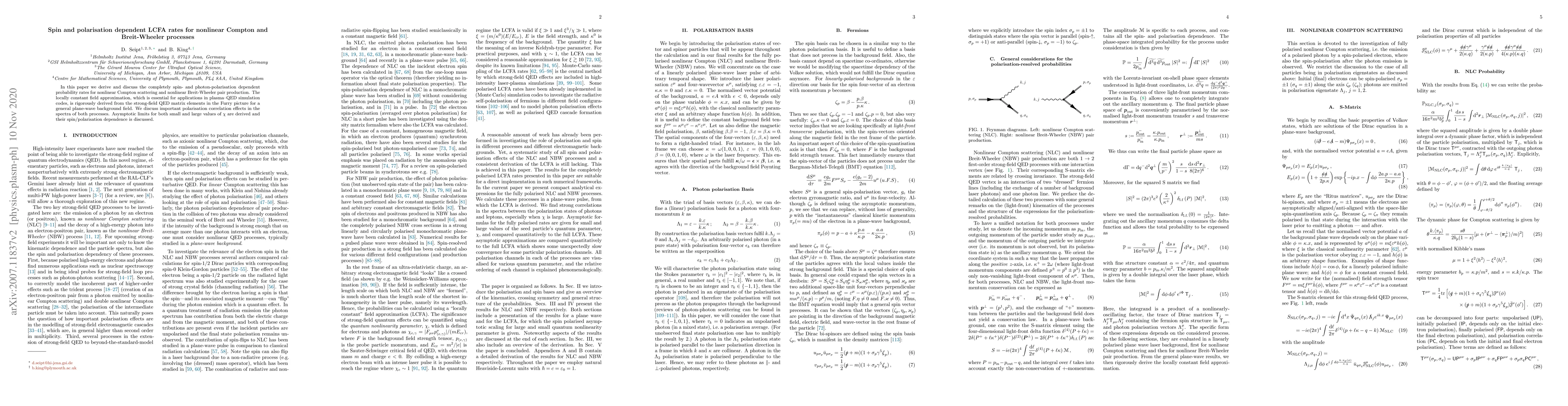 This paper derives spin- and photon-polarisation dependent rates for nonlinear Compton scattering and nonlinear Breit-Wheeler pair production using the locally constant field approximation. It rigorously applies strong-field QED matrix elements and discusses polarisation correlation effects and asymptotic limits for varying $\chi$ values.