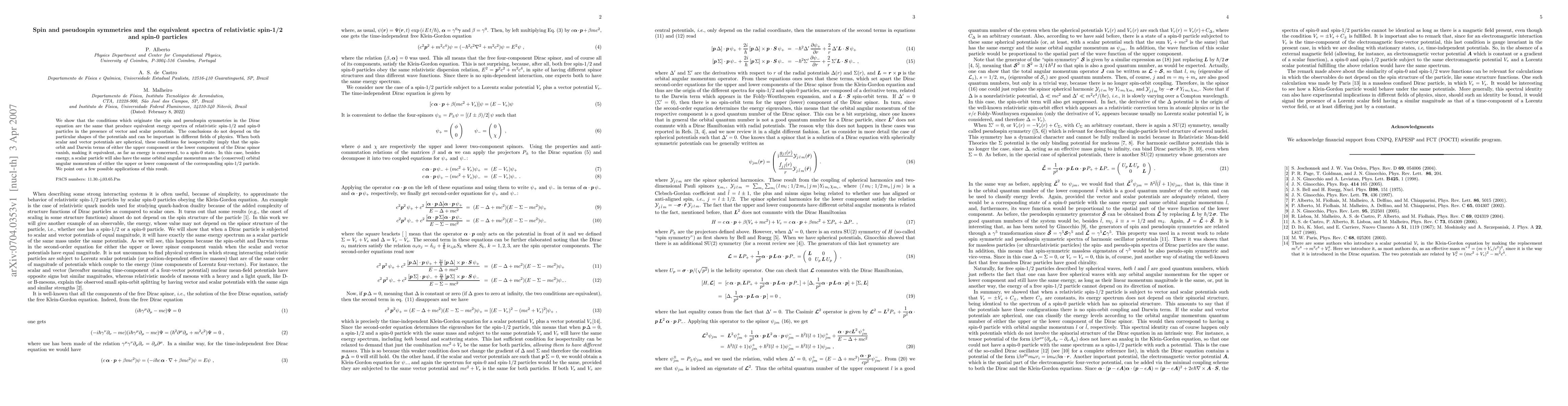 A study shows that relativistic spin-1/2 particles have equivalent energy spectra to spin-0 particles when certain symmetries in the Dirac equation are met, with implications for physics applications.