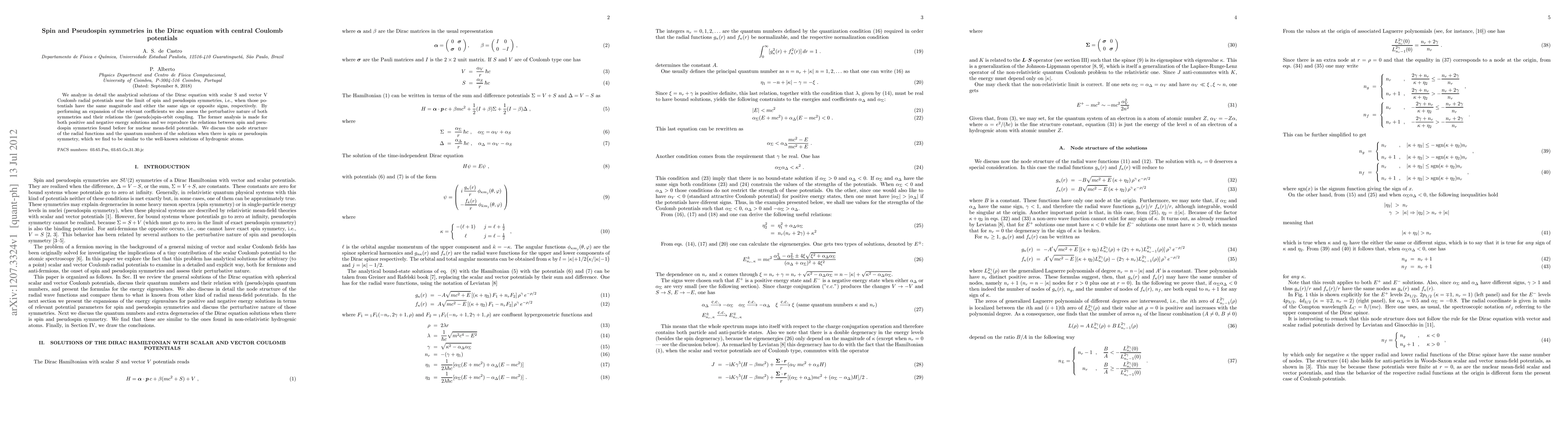 We analyze in detail the analytical solutions of the Dirac equation with scalar S and vector V Coulomb radial potentials near the limit of spin and pseudospin symmetries, i.e., when those potentials have the same magnitude and either the same sign or opposite signs, respectively. By performing an expansion of the relevant coefficients we also assess the perturbative nature of both symmetries and their relations the (pseudo)spin-orbit coupling. The former analysis is made for both positive and negative energy solutions and we reproduce the relations between spin and pseudospin symmetries found before for nuclear mean-field potentials. We discuss the node structure of the radial functions and the quantum numbers of the solutions when there is spin or pseudospin symmetry, which we find to be similar to the well-known solutions of hydrogenic atoms.