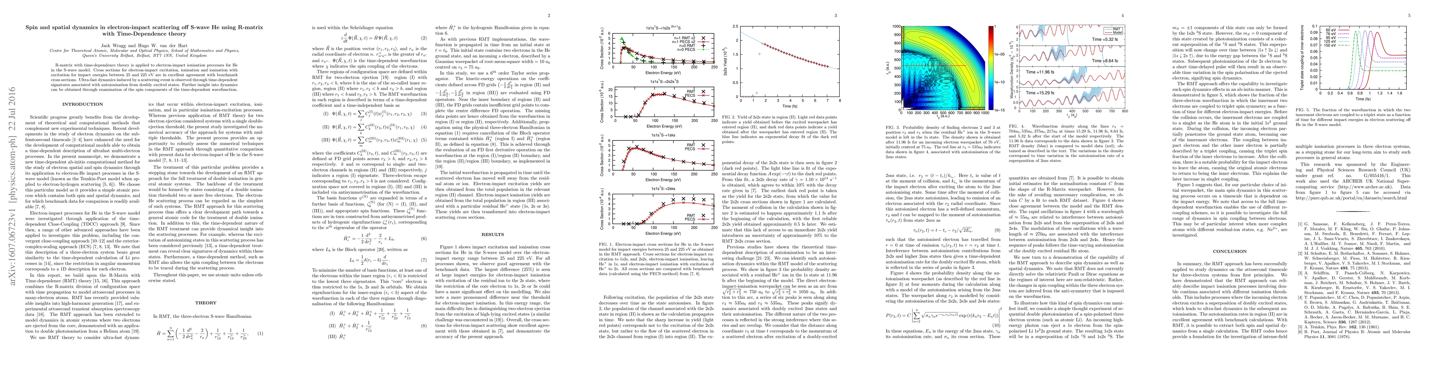 This paper applies R-matrix with time-dependence theory to study electron-impact scattering off S-wave He, achieving precise cross sections for excitation and ionisation. It reveals ultra-fast dynamics via time-dependent signatures and provides insights into spin dynamics during scattering events.