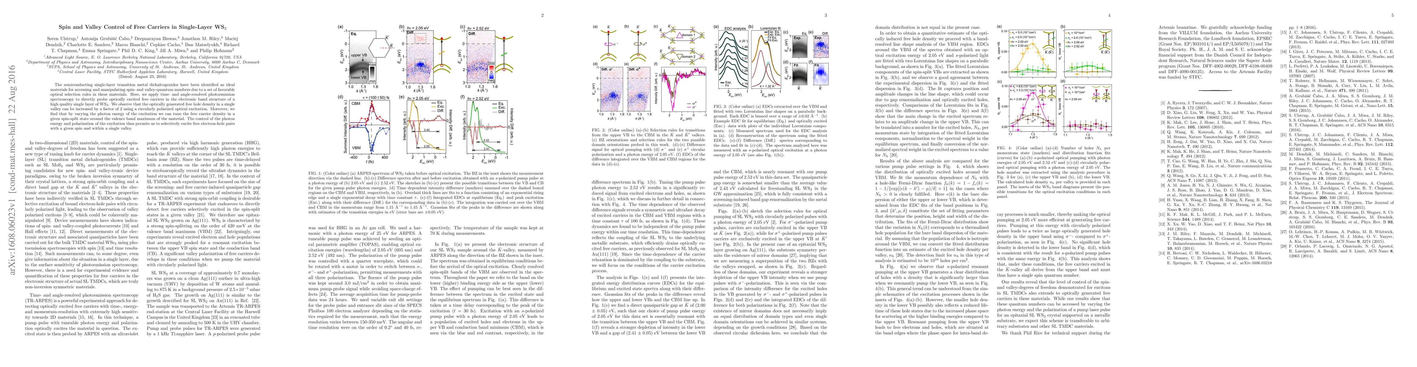 This study utilizes time- and angle-resolved photoemission spectroscopy to investigate free carriers in single-layer WS$_2$, demonstrating that circularly polarized light can double the hole density in a single valley, while varying photon energy tunes the free carrier density in spin-split states. This control allows selective excitation of electron-hole pairs with specific spin and valley characteristics.